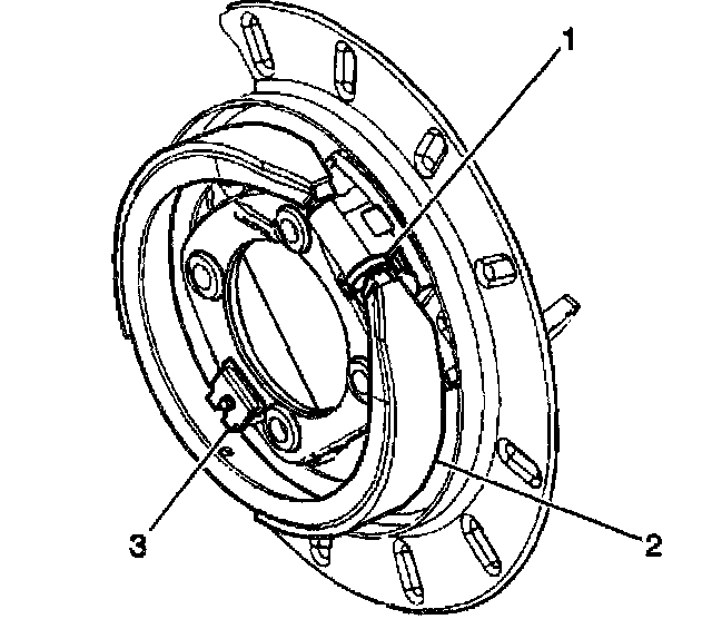 9. Slide the park brake shoe (2) down until it is disengaged from the hold down spring (3).