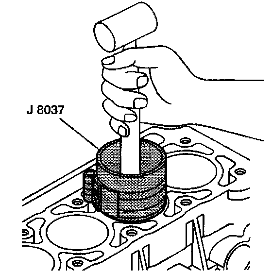 2.8. Hold the J 8037 against the engine block until all the rings have entered the cylinder bore.