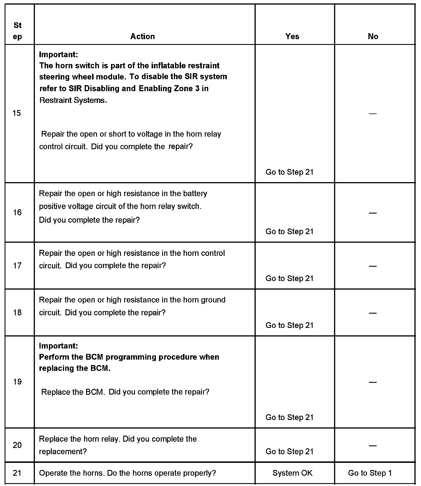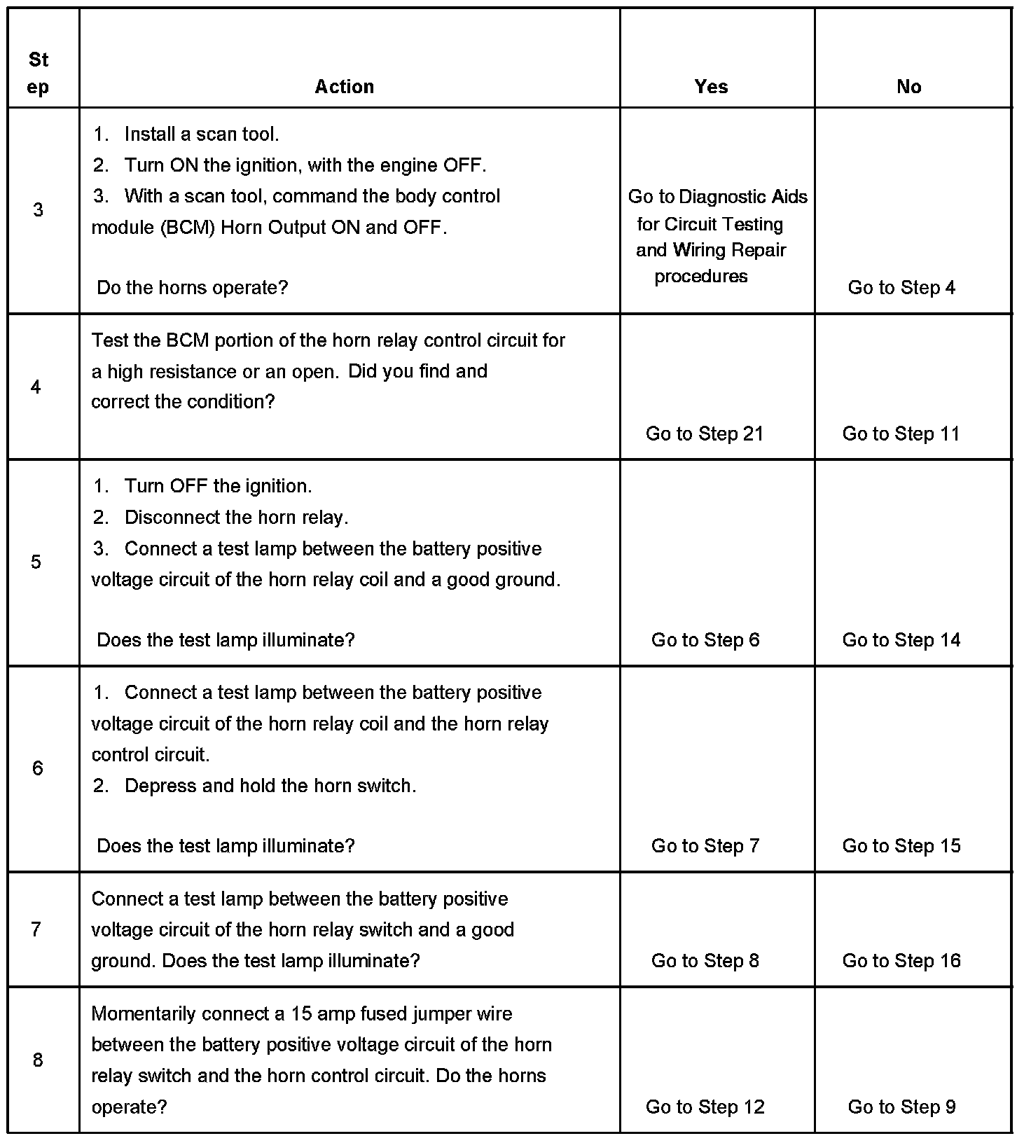 15. The horn relay control circuit includes the horn switch. The horn switch must be tested for a high resistance, an open or a short to voltage when testing the relay control circuit.