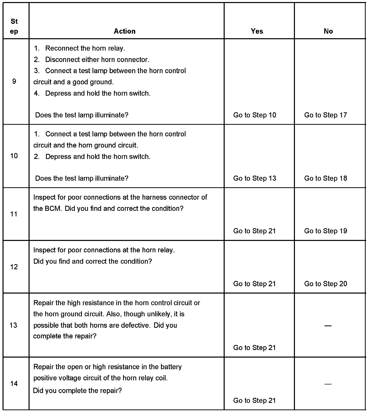 13. The horns need maximum current flow to operate properly. A high resistance, greater than 0.5 ohms, in the horn control circuit or the horn ground circuit could cause operating problems with the horns. Inspect the circuits for faults that would restrict current flow.