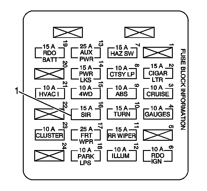 3. Install the SIR fuse into the I/P fuse block (1) located in the I/P fuse block.