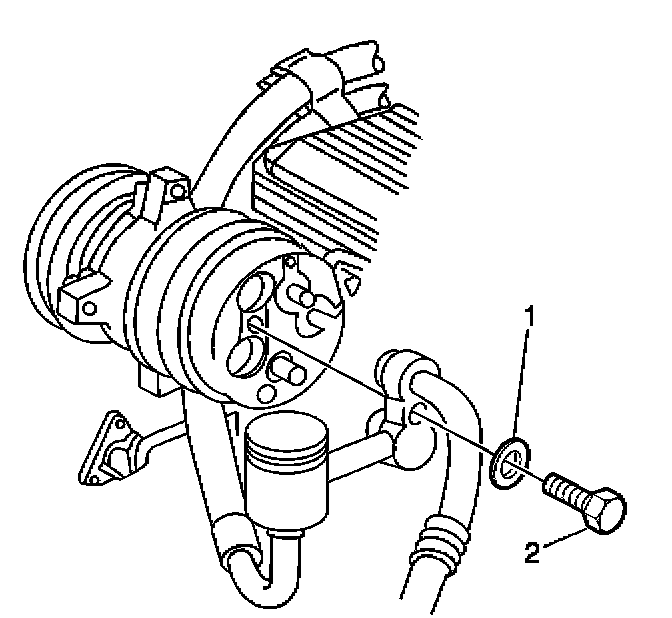 2. Remove the compressor hose assembly bolt (2) and the washer (1).