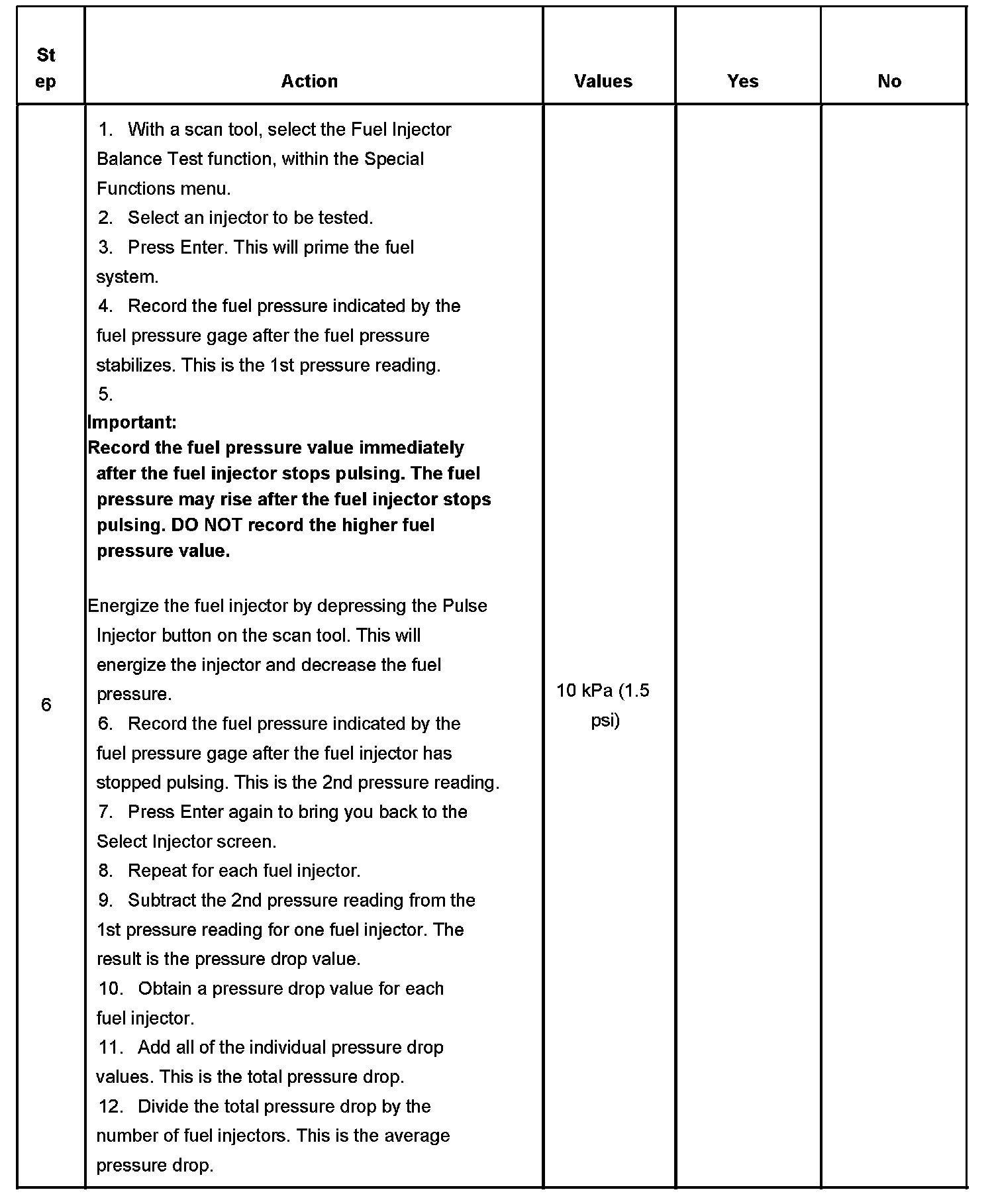 The scan tool is first used to energize the fuel pump relay. The scan tool is then used to pulse each injector for a precise amount of time allowing a measured amount of fuel into the manifold. This causes a drop in system fuel pressure that can be recorded and used to compare each injector.