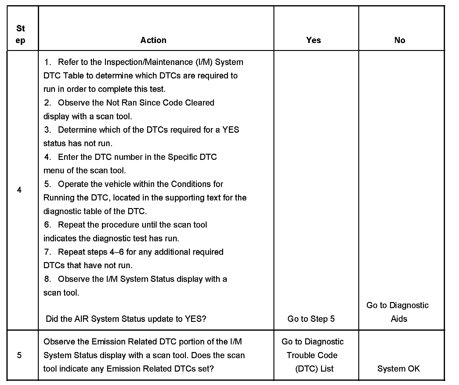 3. This step is to identify a first failure of a type B DTC. A DTC only appears on the I/M System Status display when the DTC becomes a MIL illuminating DTC. This occurs on the second failure of a type B DTC. A first failure of a type B DTC will not allow the I/M System Status to update to YES. Refer to Diagnostic Aids.