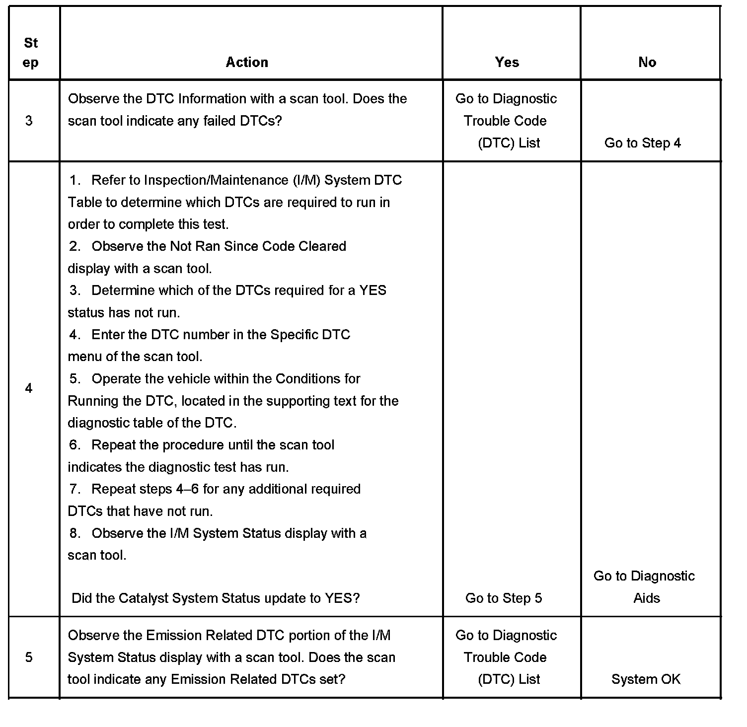 3. This step is to identify a first failure of a type B DTC. A DTC only appears on the I/M System Status display when the DTC becomes a MIL illuminating DTC. This occurs on the second failure of a type B DTC. A first failure of a type B DTC will not allow the I/M System Status to update to YES. Refer to Diagnostic Aids.