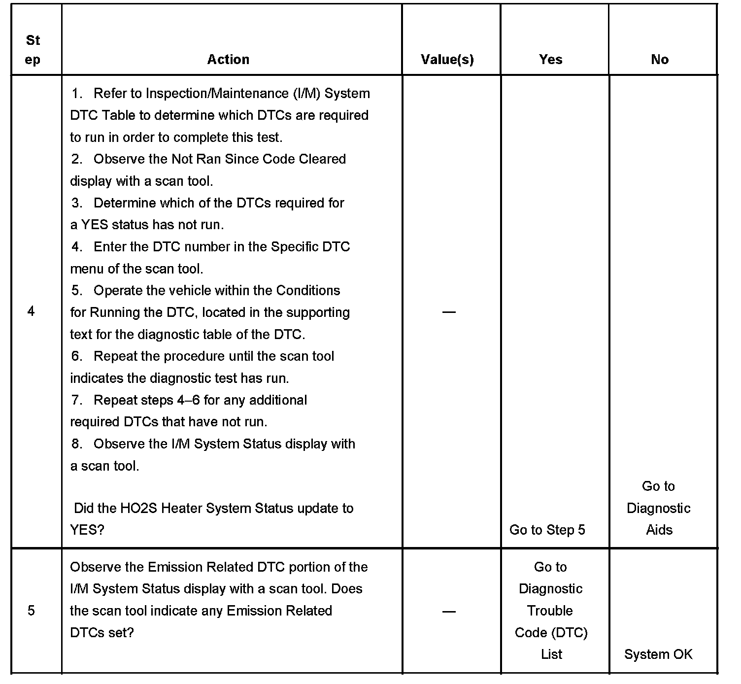 3. This step is to identify a first failure of a type B DTC. A DTC only appears on the I/M System Status display when the DTC becomes a MIL illuminating DTC. This occurs on the second failure of a type B DTC. A first failure of a type B DTC will not allow the I/M System Status to update to YES. Refer to Diagnostic Aids.