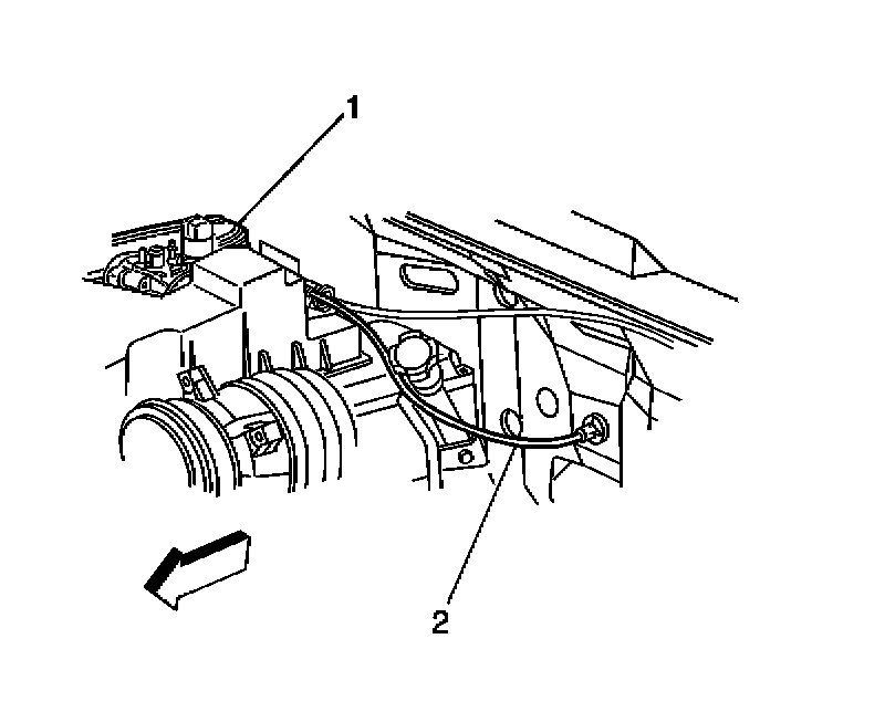 7. Install the accelerator cable (1) through the slot in the accelerator pedal assembly (2) and snap into place.