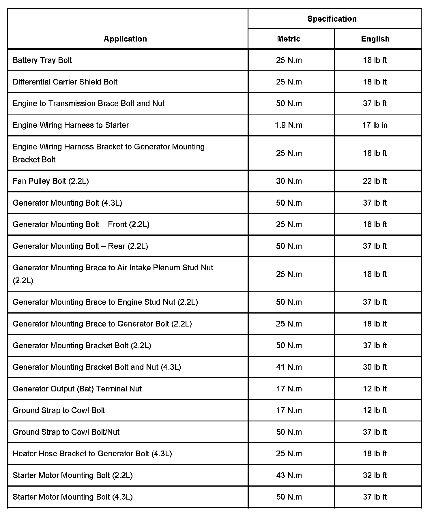 Starting and Charging: Specifications