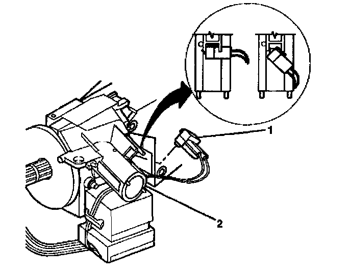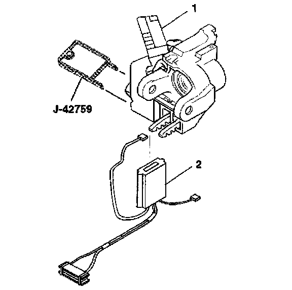 7. Insert J 42759 into the electronic lock module assembly (1) and slide the ignition and key alarm switch assembly (2) out.