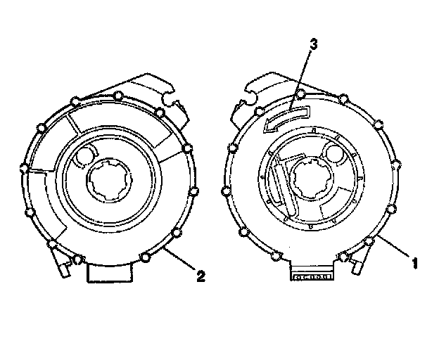 5. For no centering window on the front side (2) of the inflatable restraint steering wheel module coil and no spring service lock on the back side (1), perform the following steps:
