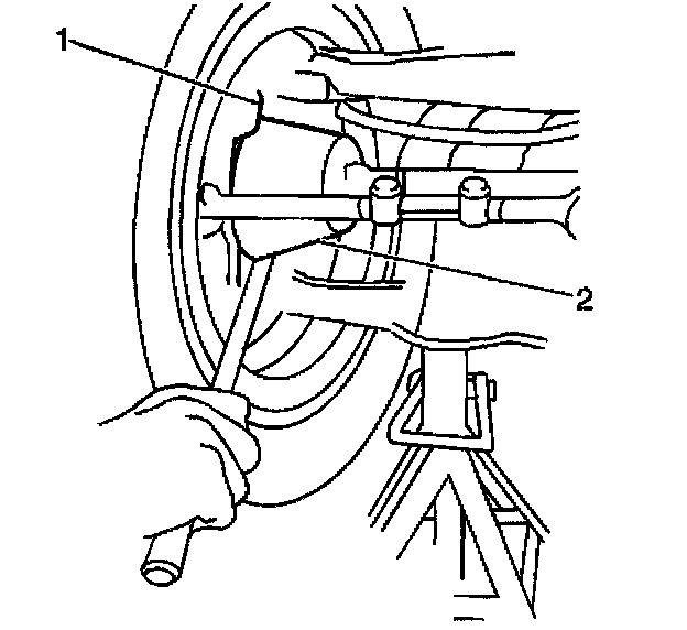 8. Pry between the lower control arm (2) and the outer bearing race (1) while reading the dial indicator. This shows vertical looseness in the lower ball joints. The lower ball joint may show some looseness.