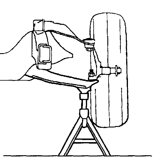^ Place floor stands under the lower control arms as far outboard as possible (between spring seats and ball joint) to maintain maximum leverage.