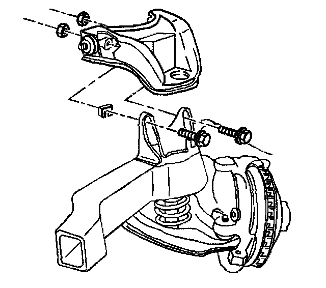 5. Remove the retaining bolts and nuts from the upper control arm. Note the location of any shims.