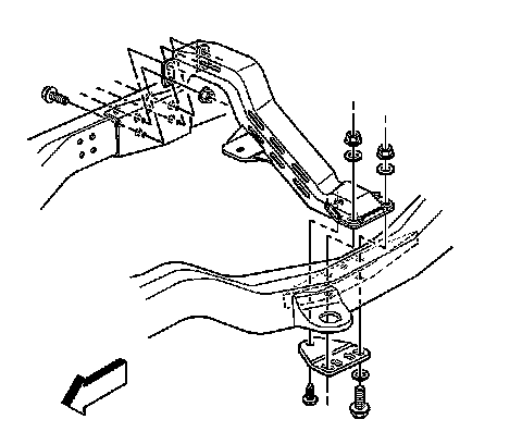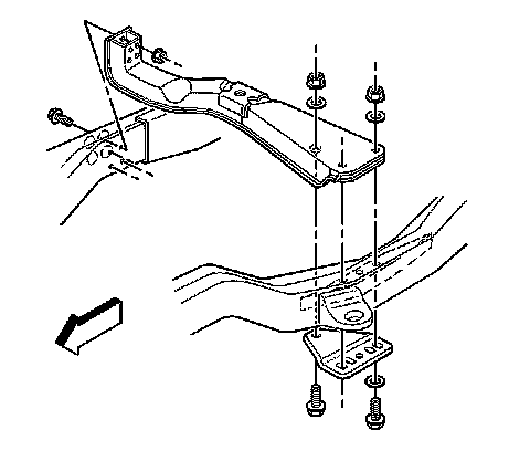 9. Remove the transmission support to the frame nuts, bolts, and reinforcement, 4.3 L pickup.