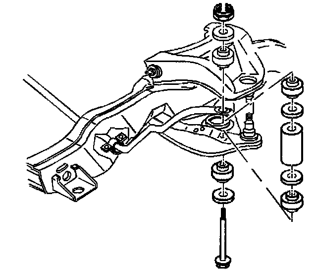 2. Install the stabilizer shaft link bolt through the lower control arm hole. Stack the parts in the following order: