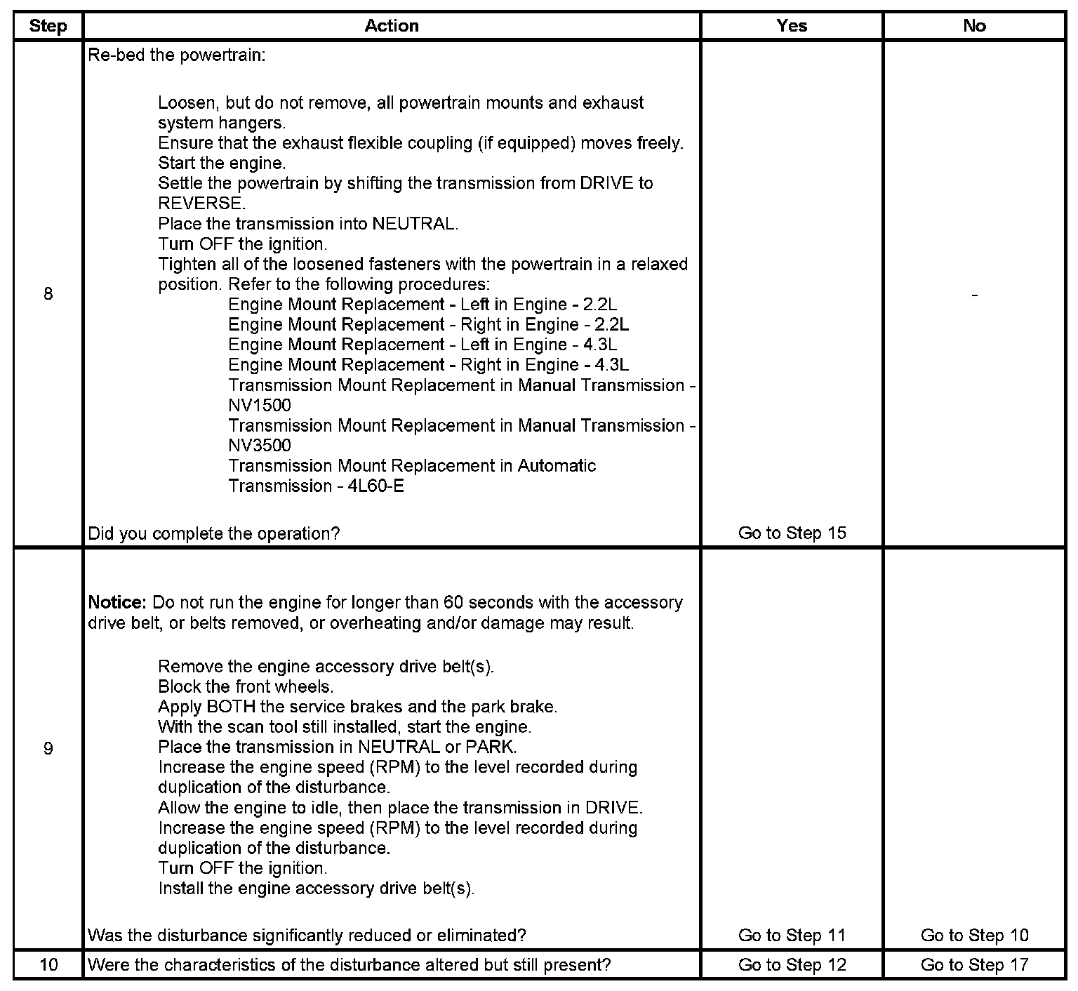 10. Non-rotating engine driven accessory components can no longer produce a unique disturbance. If a disturbance is still present, but the characteristics have been altered, it is possible that these component systems are acting as a transfer path for engine firing frequency or a first order engine disturbance.