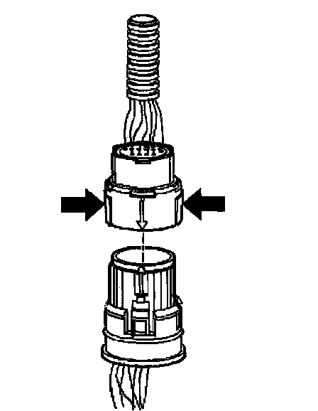 ^ In order to reinstall the external wiring connector, first orient the pins by lining up the arrows on each half of the connector. Push the connector straight down into the transmission without twisting or angling the mating parts.