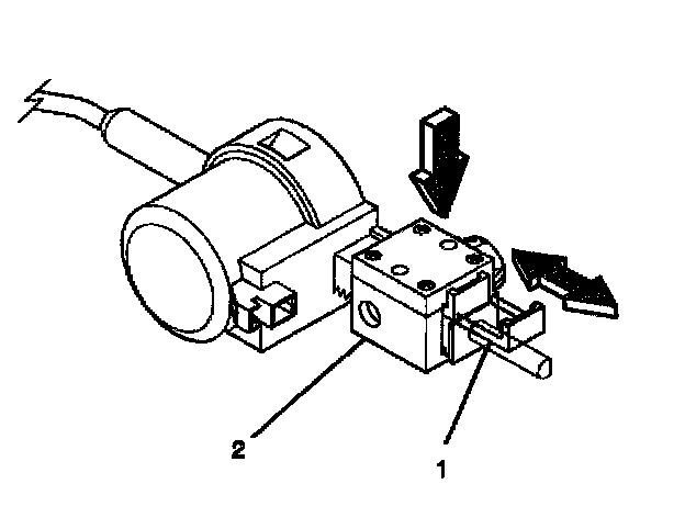 3.1. Pull out the tab (1) on the adjuster block side (2) of the automatic transmission shift lock control actuator.