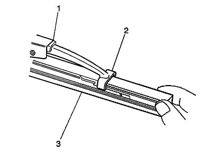 3. Engage the bottom claw (2) of the wiper blade (1) into the notches in wiper blade element (3).