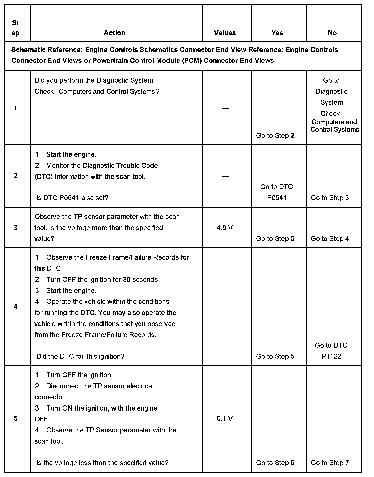 CIRCUIT DESCRIPTIONThe throttle position (TP) sensor is used by the powertrain control module (PCM) to determine the throttle plate angle for various engine management systems. The TP sensor is a potentiometer type sensor with a 5-volt reference circuit, a low reference circuit, and a signal circuit. The PCM provides the TP sensor with 5 volts on the 5-volt reference circuit and a ground on the low reference circuit. Rotation of the TP sensor rotor from the closed throttle position to the wide open throttle (WOT) position provides the PCM with a signal voltage from less than 1 volt to more than 4 volts through the TP sensor signal circuit. If the PCM detects an excessively high signal voltage, DTC P0123 sets.