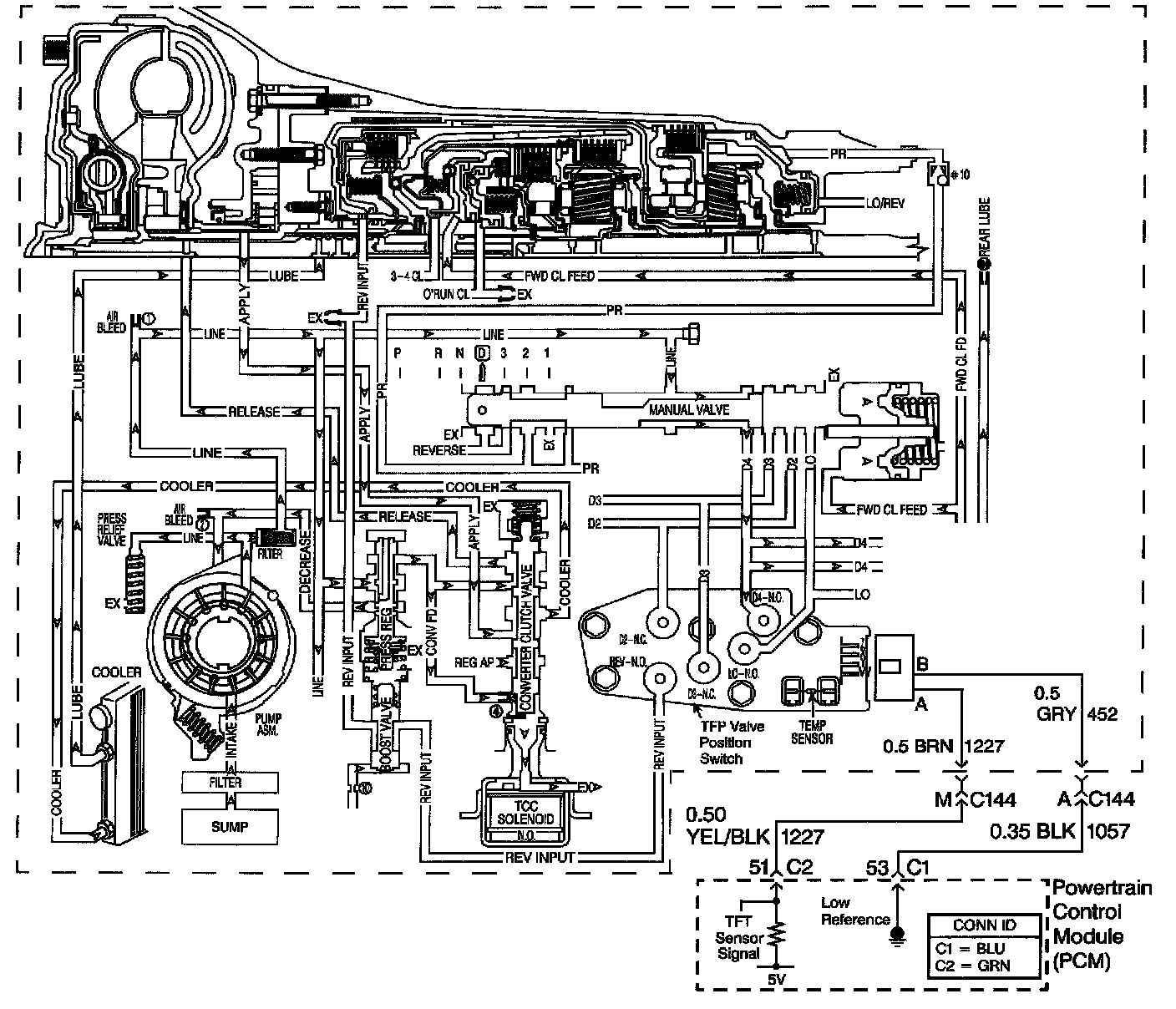 The flow of transmission fluid starts in the bottom pan and is drawn through the filter, control valve body assembly, transmission case and into the oil pump assembly. The oil pump assembly pressurizes the fluid and directs it to the pressure regulator valve where it becomes the main supply of fluid to the various components and hydraulic circuits in the transmission. Hot fluid exiting the torque converter flows through the converter clutch apply valve and into the transmission cooler lines to the oil cooler located in the vehicle radiator, and auxiliary cooler if equipped. From the cooler, fluid returns to cool and lubricate the front of the transmission. In forward drive ranges, D4 fluid from the manual valve is routed through an orificed cup plug in the rear of the transmission case to feed the rear lube fluid circuit.