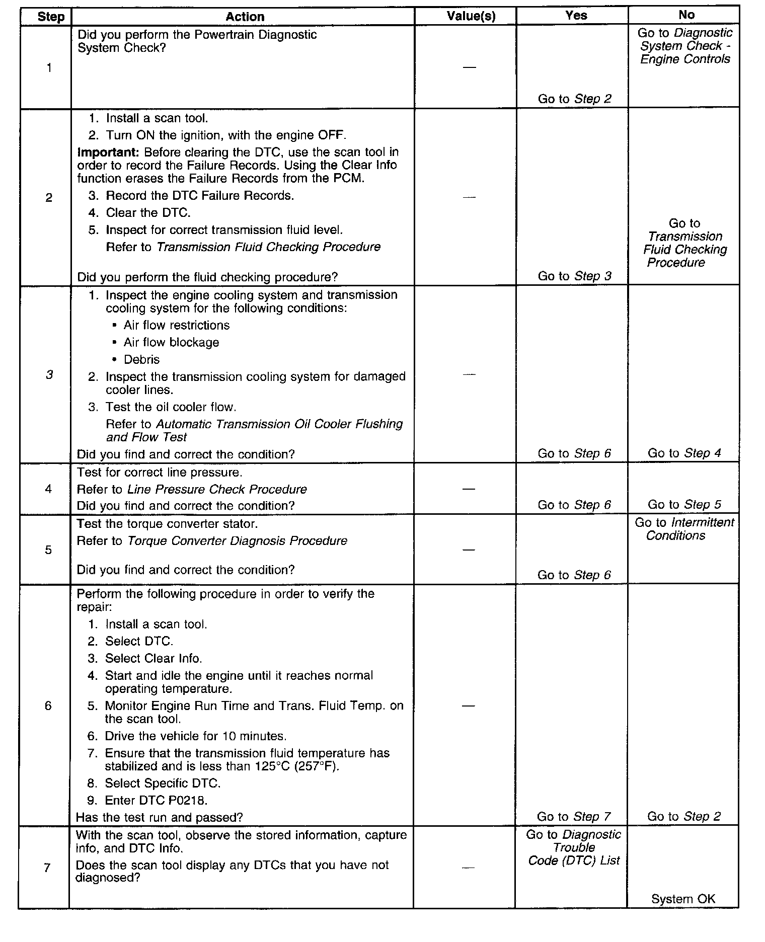 When the vehicle control module (PCM) detects a high transmission fluid temperature (TFT) for a long period of time, then DTC P0218 sets. DTC P0218 is a type C DTC.
