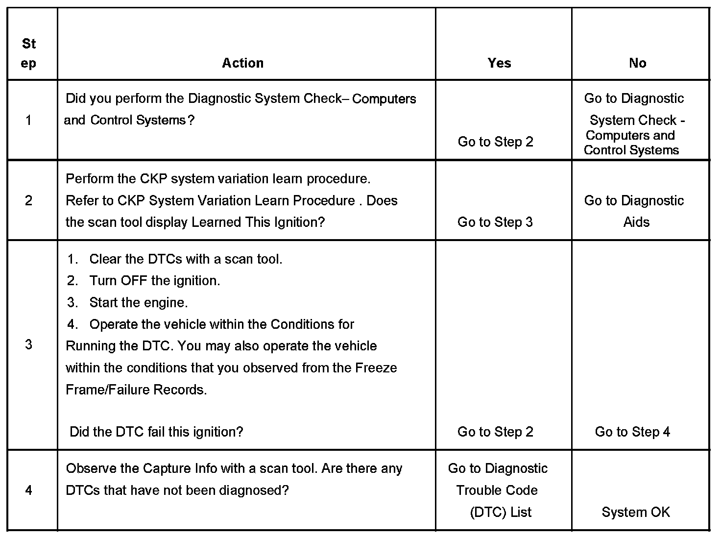 The CKP system variation compensating values are stored in PCM memory after a learn procedure has been performed. If the actual CKP variation is not within the CKP system variation compensating values stored in the PCM memory, DTC P0300 may set.
