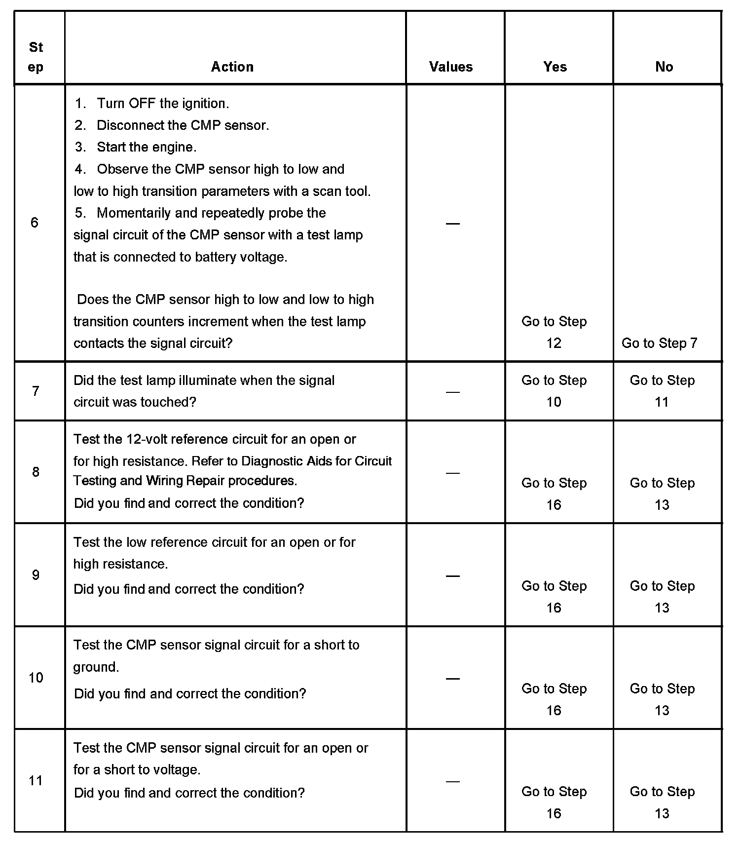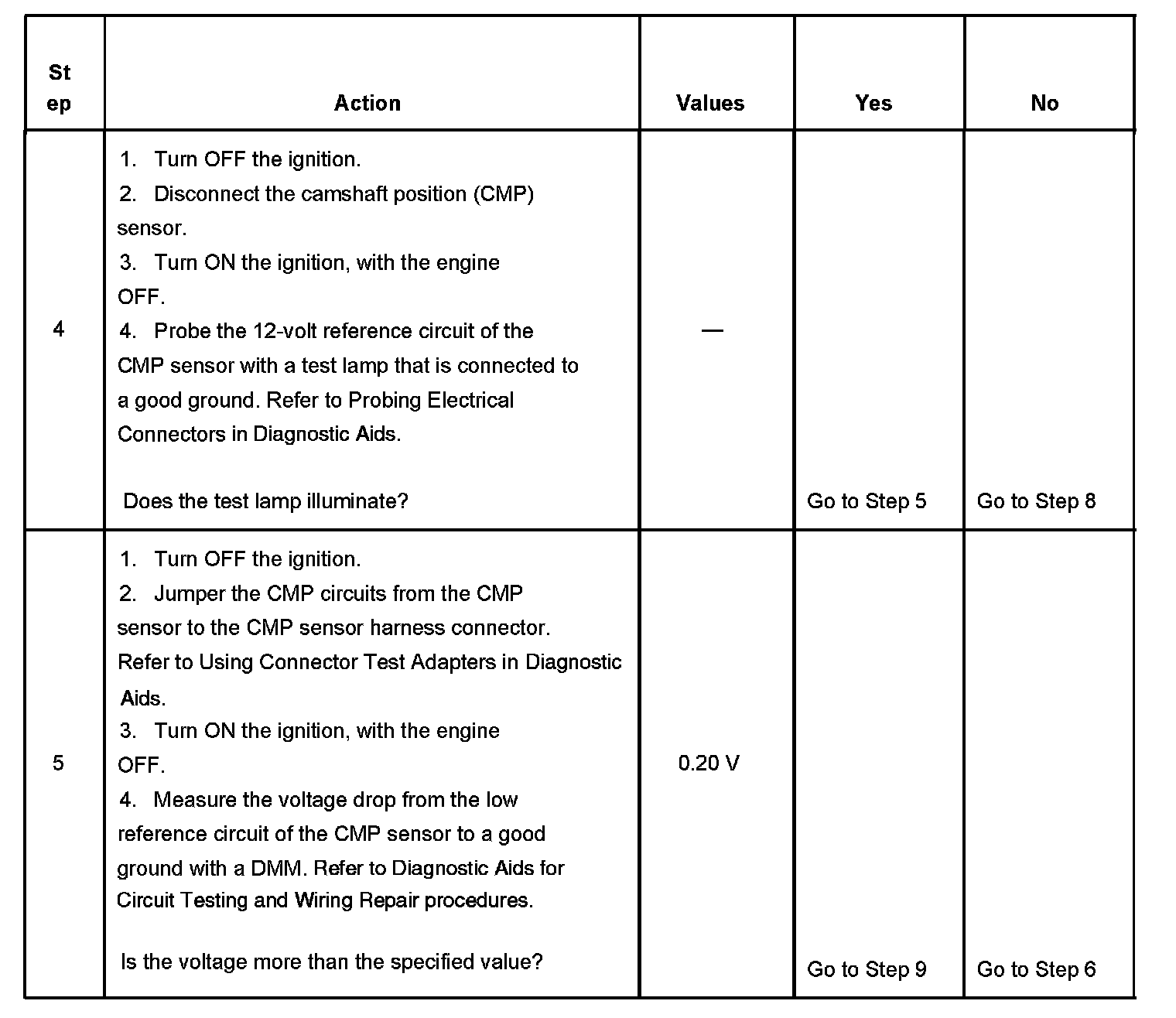 6. This step tests the CMP sensor signal circuit. Applying a voltage causes the CMP sensor high to low and low to high parameter to increase if the circuit and the PCM are operating properly.