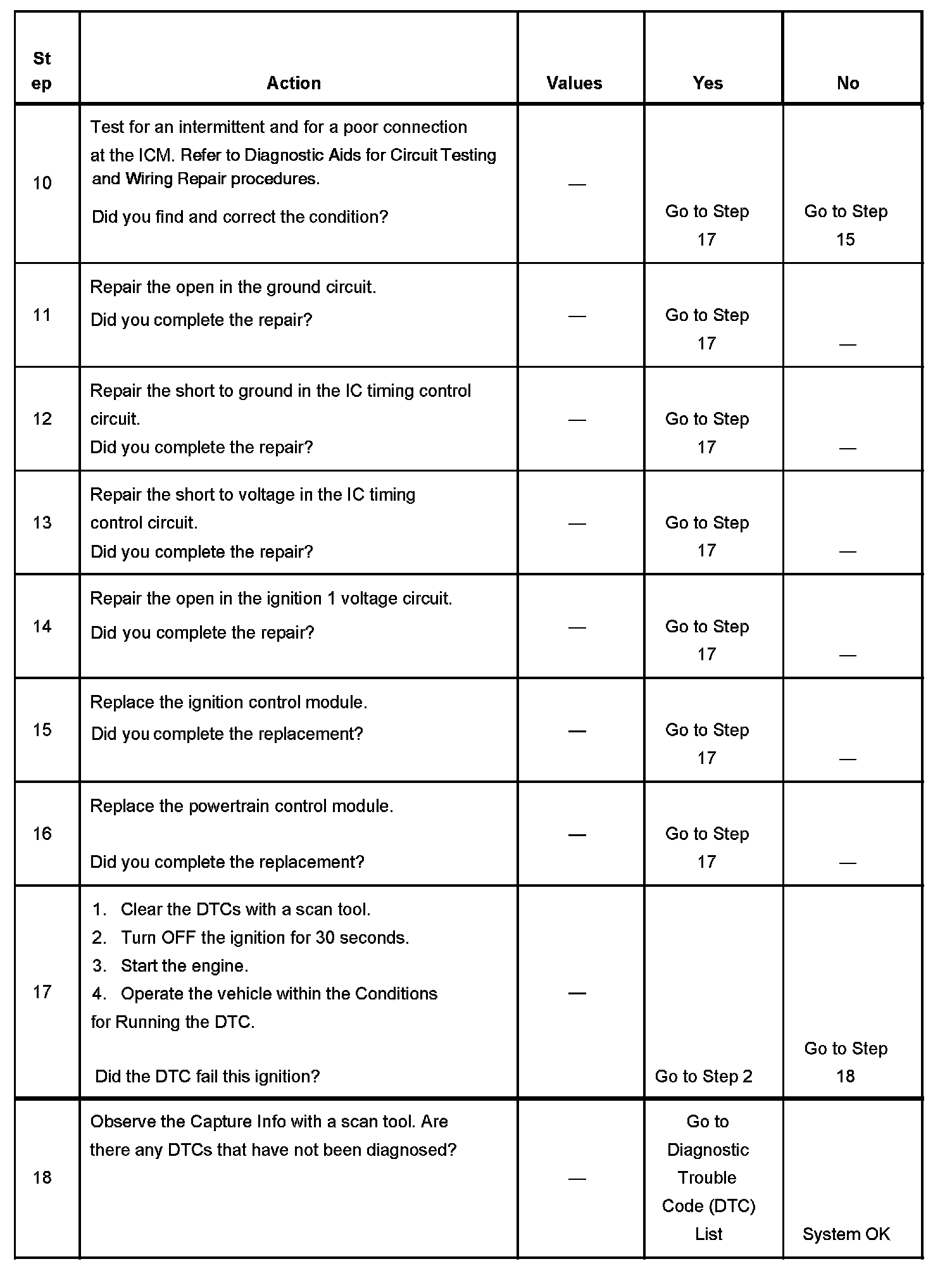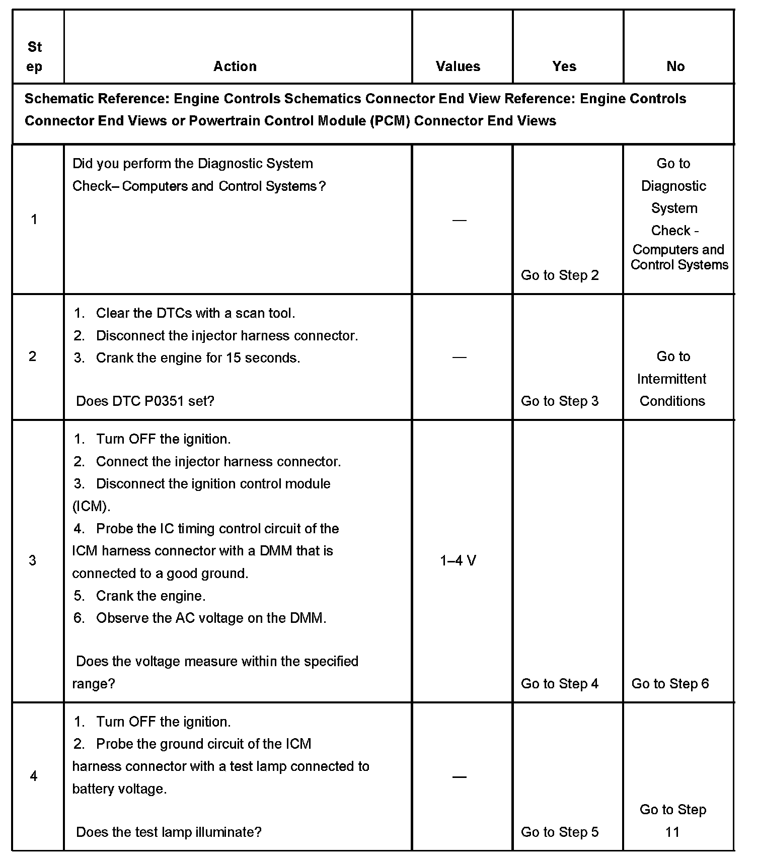 CIRCUIT DESCRIPTIONThe enhanced ignition system uses the crankshaft position (CKP) sensor to provide a timing input to the control module. Ignition control (IC) spark timing for each cylinder is based on this input. The control module provides the ignition timing signal to the ignition control module (ICM) to control the ignition coil. Each timing pulse detected by the ICM allows the ICM to energize the ignition coil. A large secondary ignition voltage is induced in the secondary coil winding by the primary coil winding. This high voltage is switched to the correct spark plug by the distributor. If the powertrain control module (PCM) detects an unusually high or low voltage on the ignition signal circuit, DTC P0351 sets.