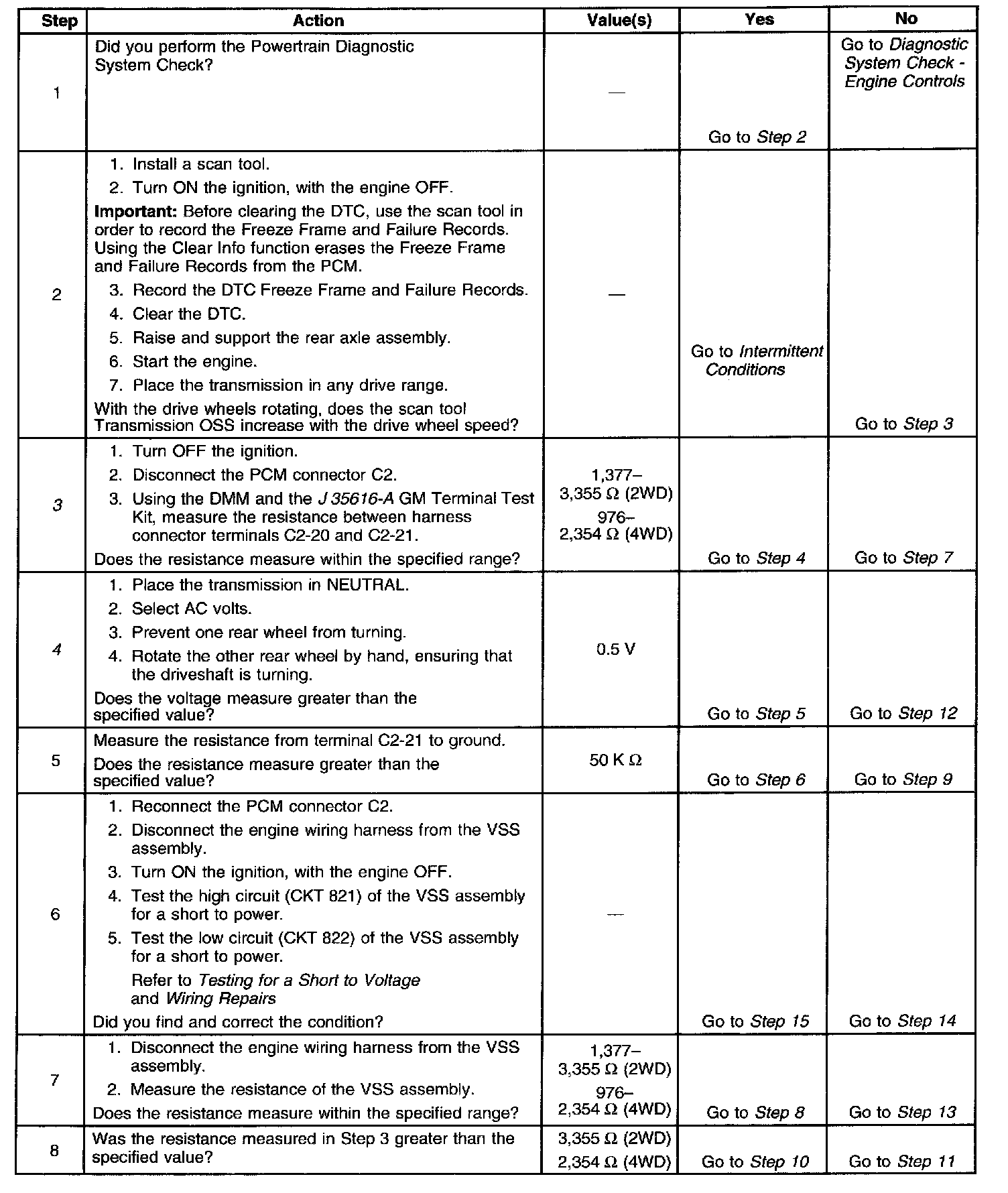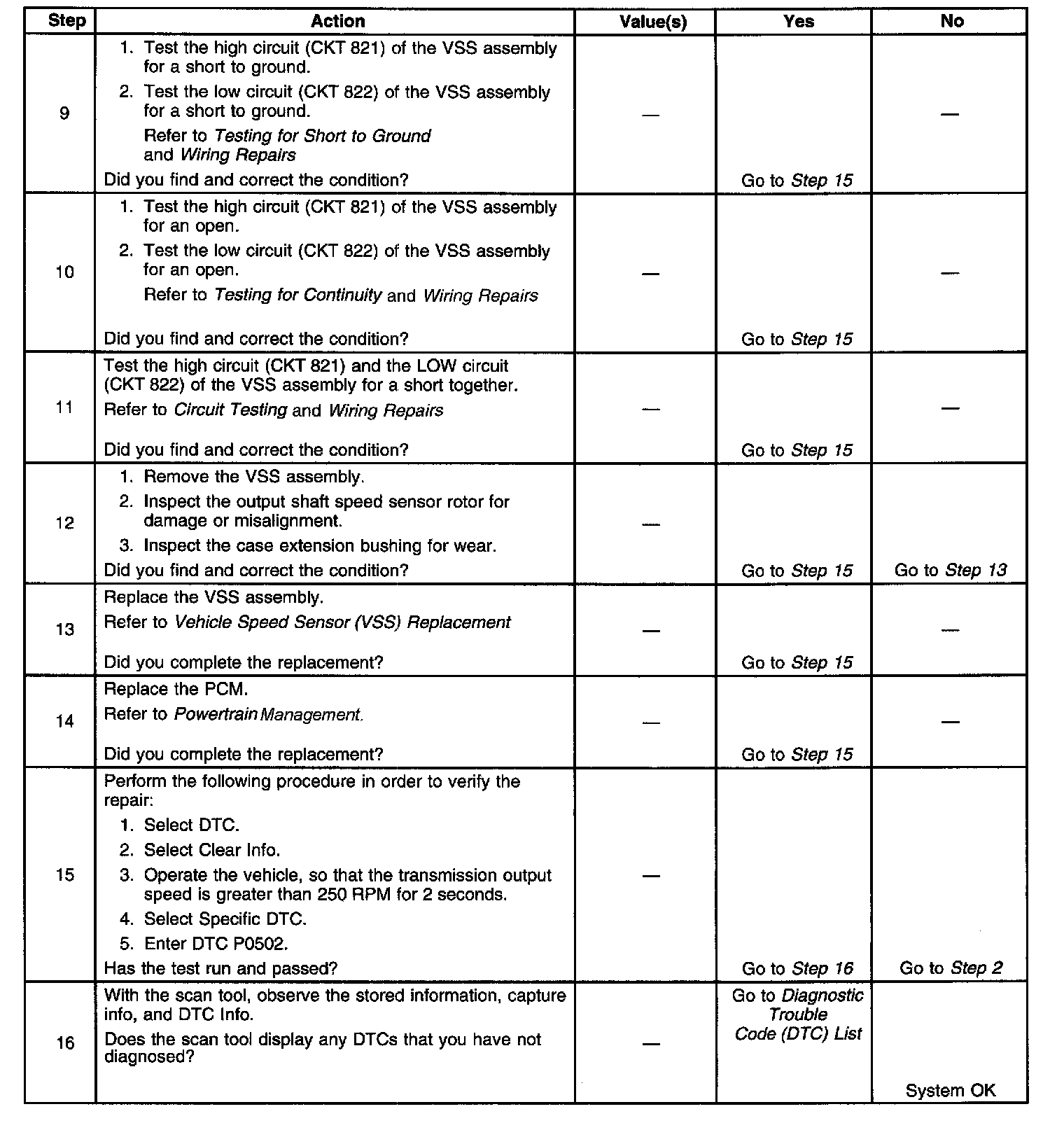 When the PCM detects a low vehicle speed when there is a high engine speed in a drive gear range, then DTC P0502 sets. DTC P0502 is a type B DTC.