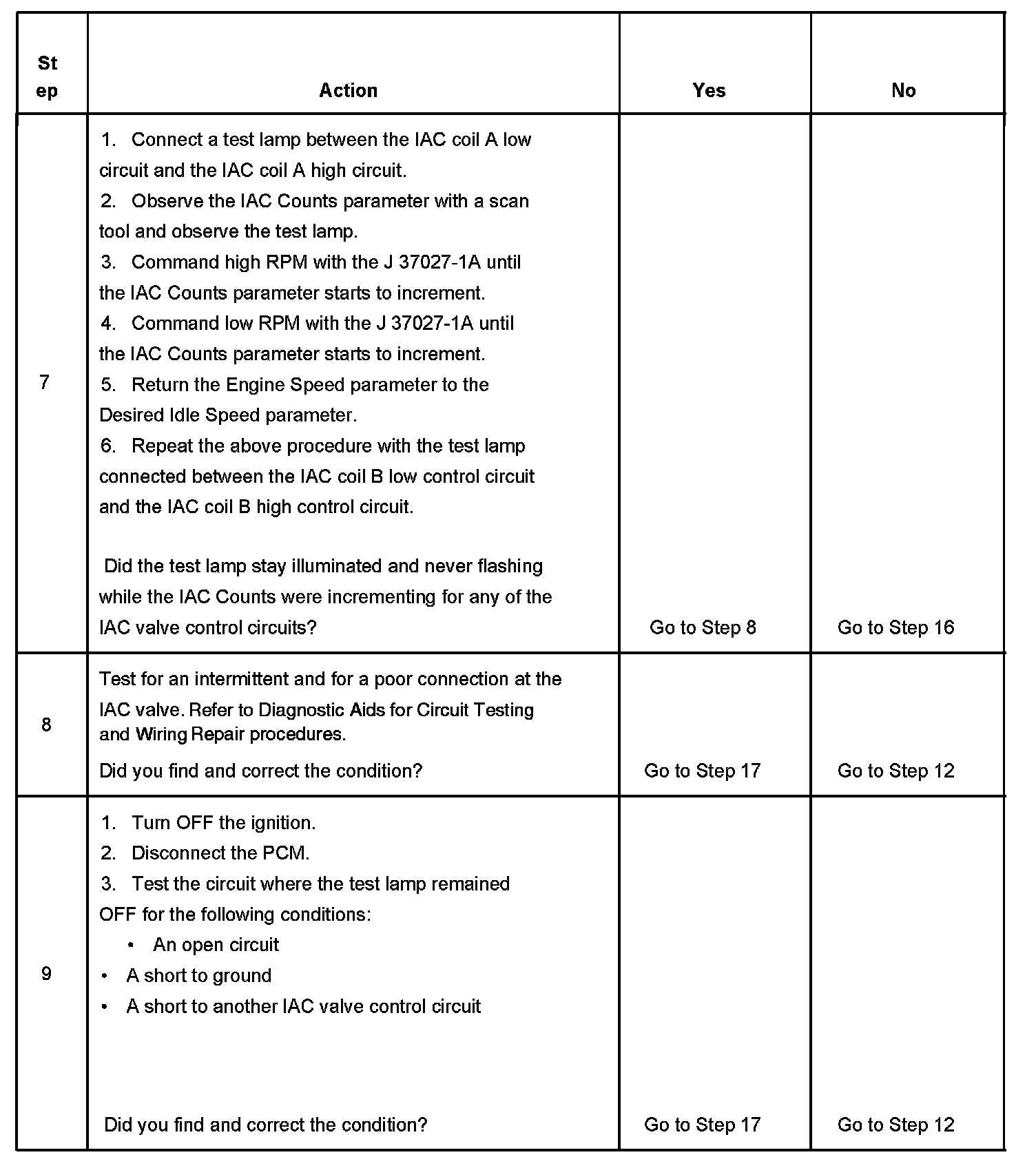 7. This test will determine the ability of the PCM to provide the IAC valve control circuits with a ground. On a normal operating system, the test lamp should not flash while the IAC Counts are incrementing.