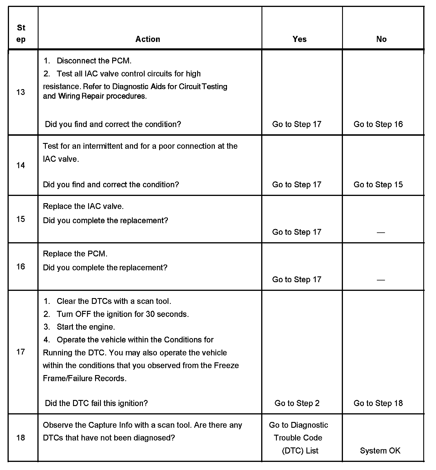 CIRCUIT DESCRIPTIONThe engine idle speed is controlled by the idle air control (IAC) valve. The IAC valve is on the throttle body. The IAC valve pintle moves in and out of an idle air passage bore to control air flow around the throttle plate. The IAC valve consists of a movable pintle, driven by a gear attached to an electric motor called a stepper motor. The stepper motor is capable of highly accurate rotation, or of movement, called steps. The stepper motor has 2 separate windings that are called coils. Each coil is supplied current by two circuits from the powertrain control module (PCM). When the PCM changes polarity of a coil, the stepper motor moves one step. The PCM uses a predetermined number of counts to determine the IAC pintle position. Observe IAC counts with a scan tool. The IAC counts will increment up or down as the PCM attempts to change the IAC valve pintle position. An IAC Reset will occur when the ignition key is turned OFF. First, the PCM will seat the IAC pintle in the idle air passage bore. Second, the PCM will retract the pintle a predetermined number of counts to allow for efficient engine start-up. If the engine idle speed is out of range for a calibrated period of time, an idle speed diagnostic trouble code (DTC) sets.
