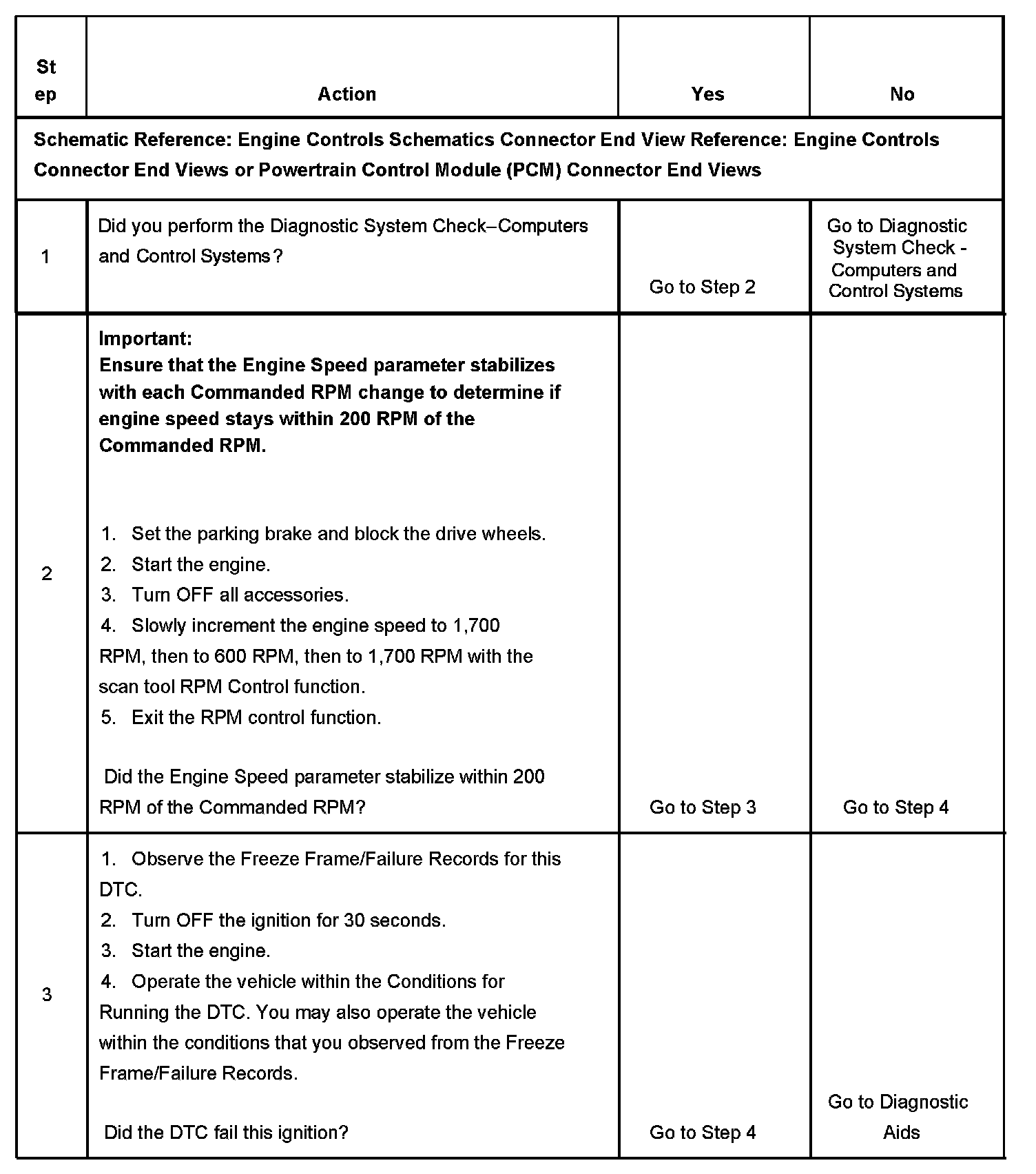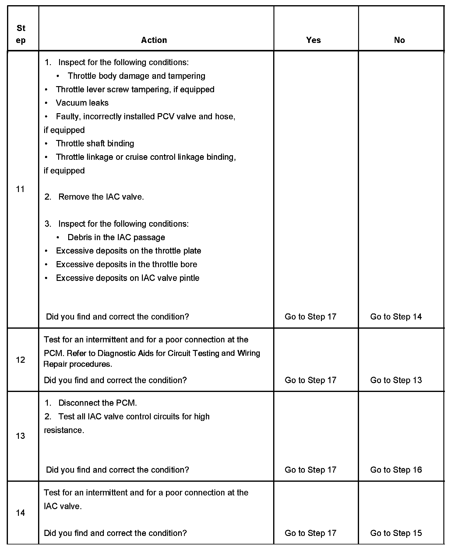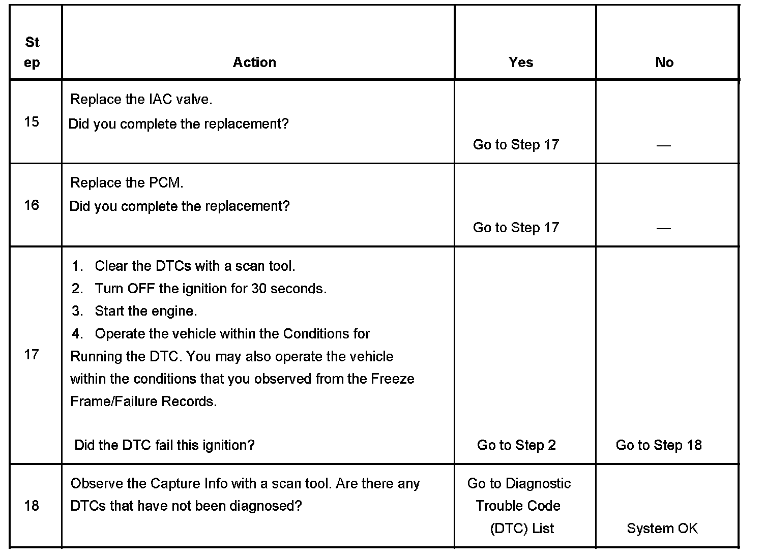 CIRCUIT DESCRIPTIONThe engine idle speed is controlled by the idle air control (IAC) valve. The IAC valve is on the throttle body. The IAC valve pintle moves in and out of an idle air passage bore to control air flow around the throttle plate. The IAC valve consists of a movable pintle, driven by a gear attached to an electric motor called a stepper motor. The stepper motor is capable of highly accurate rotation, or of movement, called steps. The stepper motor has 2 separate windings that are called coils. Each coil is supplied current by two circuits from the powertrain control module (PCM). When the PCM changes polarity of a coil, the stepper motor moves one step. The PCM uses a predetermined number of counts to determine the IAC pintle position. Observe IAC counts with a scan tool. The IAC counts will increment up or down as the PCM attempts to change the IAC valve pintle position. An IAC Reset will occur when the ignition key is turned OFF. First, the PCM will seat the IAC pintle in the idle air passage bore. Second, the PCM will retract the pintle a predetermined number of counts to allow for efficient engine start-up. If the engine idle speed is out of range for a calibrated period of time, an idle speed diagnostic trouble code (DTC) sets.