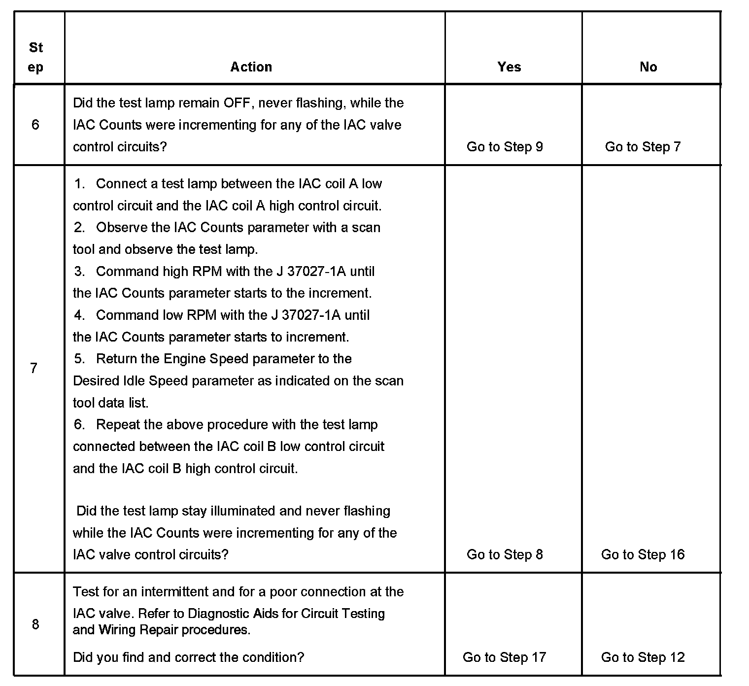 7. This test will determine the ability of the PCM to provide the IAC valve control circuits with a ground. On a normally operating system, the test lamp should not flash while the IAC Counts are incrementing.