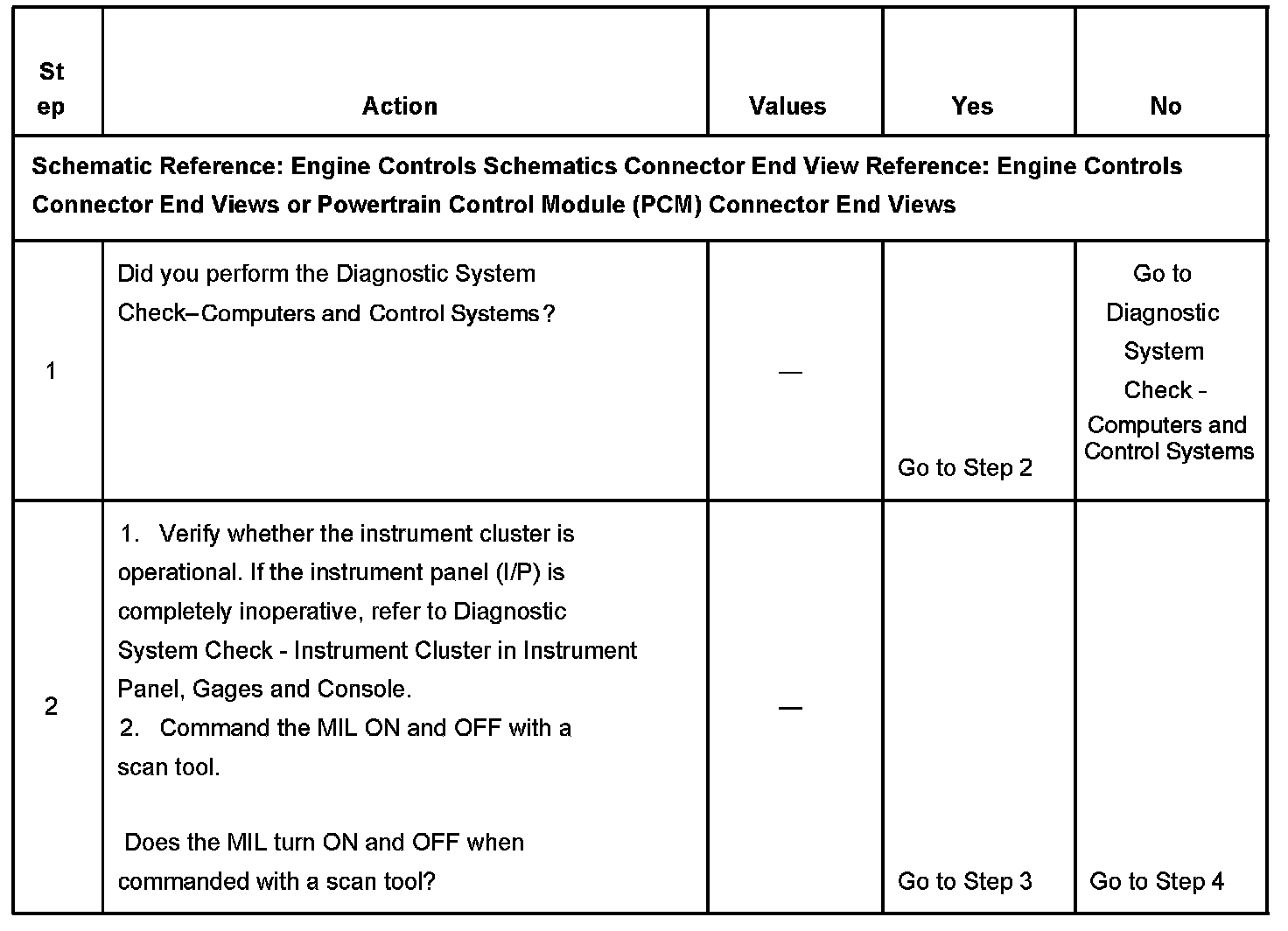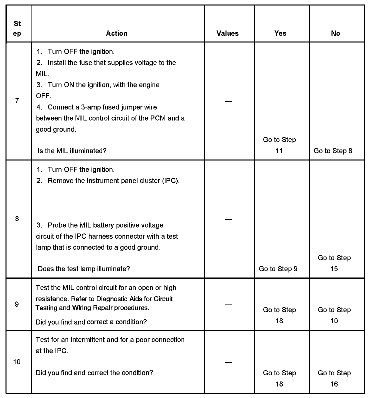 5. This step tests for a short to ground in the MIL control circuit. With the powertrain control module (PCM) disconnected and the ignition ON, the MIL should be OFF.