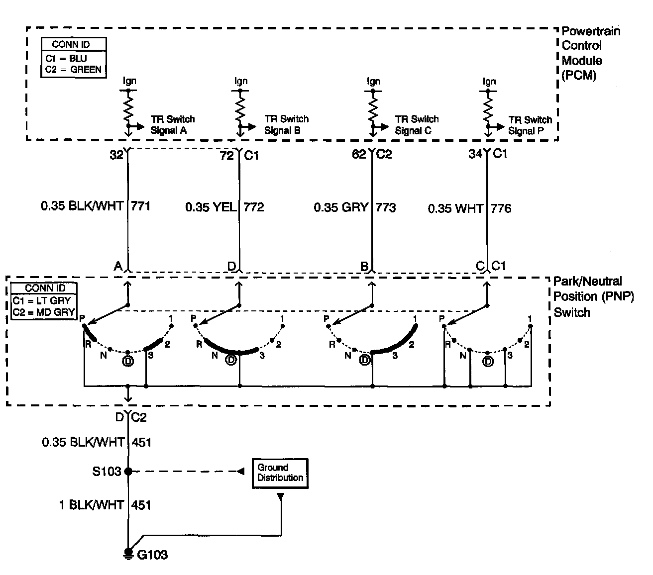 The transmission range (TR) switch is part of the park/neutral position and back-up lamp switch assembly and is externally mounted on the transmission manual shaft. The TR switch is a multi-signal switch. The PCM supplies ignition voltage to the TR switch on four signal circuits, A, B. C, and P. Each gear selector lever position grounds one or more of the switch circuits. In order to determine the gear range selected by the driver, the PCM compares the voltage combinations on the signal circuits to a look up table stored in the PCM memory. PCM detects the selected gear range by the state change of the switch input. Refer to Transmission Range Switch Logic on table.
