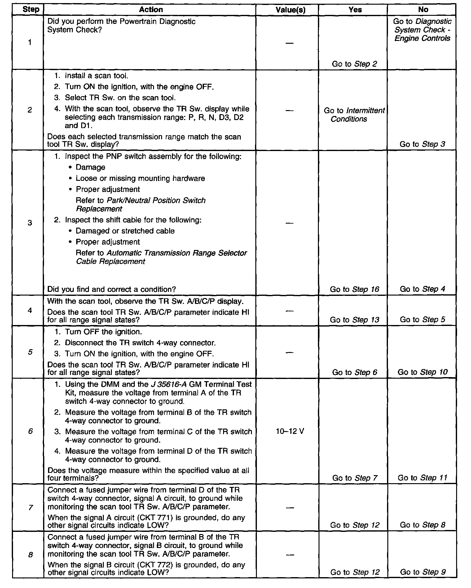 6. This step tests TR switch wiring for an open or the lack of the signal voltage from the PCM.