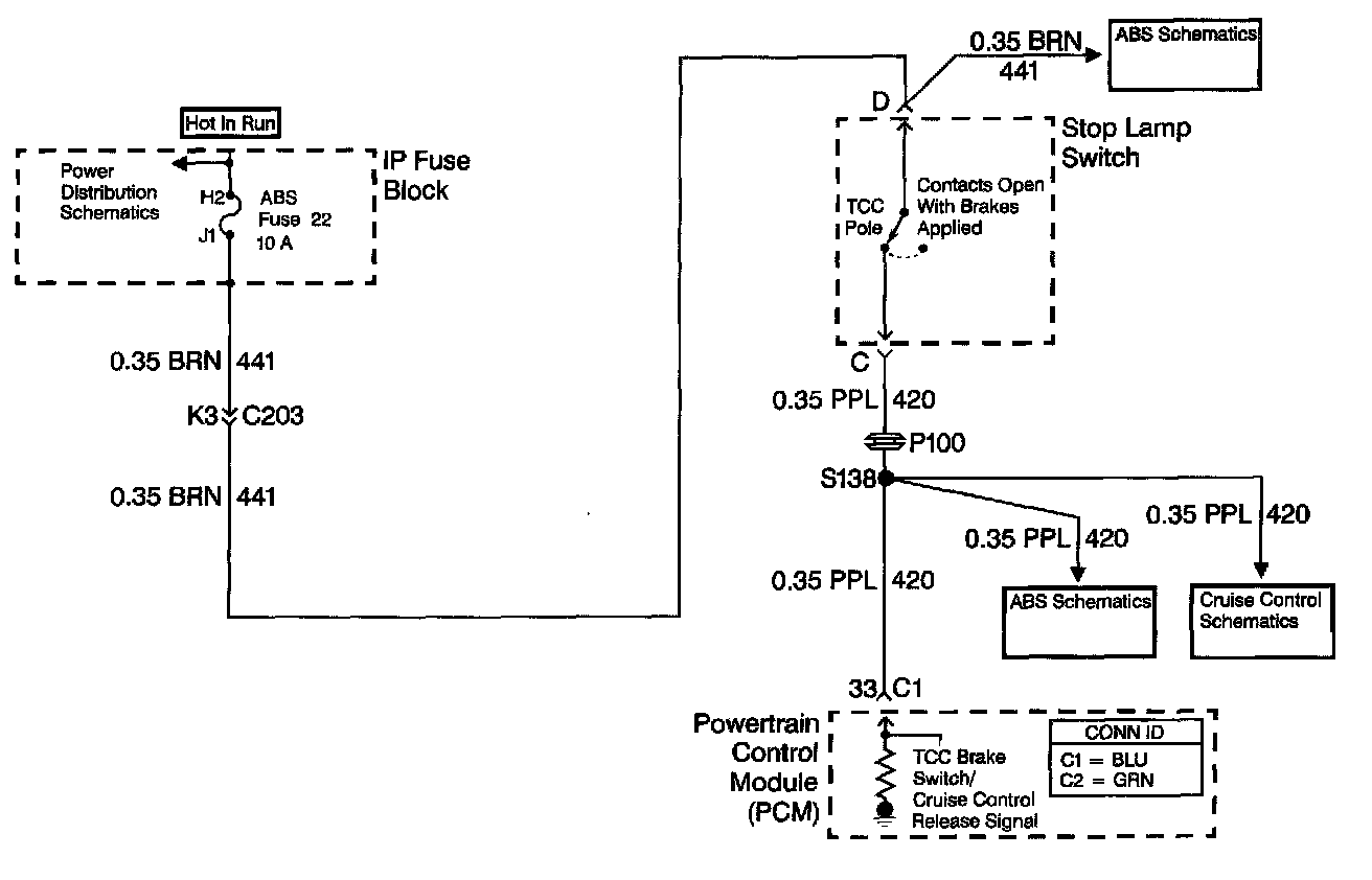 When the brake pedal is released, the PCM receives a constant voltage signal. If the PCM receives a zero voltage signal at the brake switch input, and the torque converter clutch (TCC) is engaged, the PCM de-energizes the TCC solenoid valve. The PCM disregards the brake switch input for TCC scheduling if there is a brake switch circuit fault.