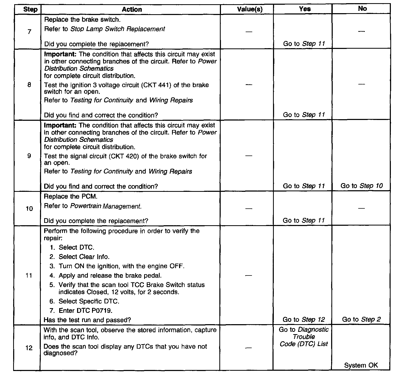 When the PCM detects an open brake switch circuit, 0 volts, low input, during accelerations, then DTC P0719 sets. DTC P0719 is a type C DTC.
