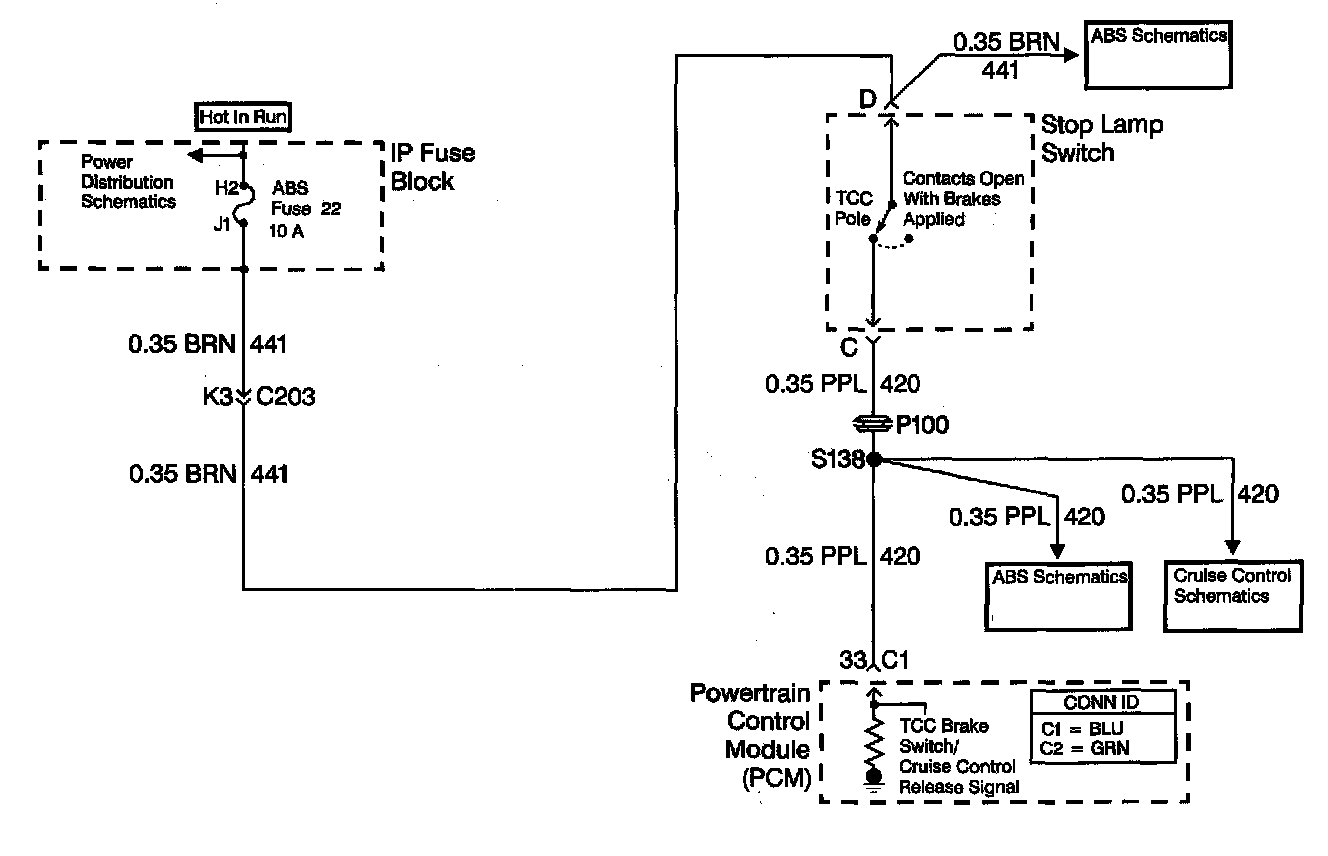 The brake switch indicates brake pedal status to the powertrain control module (PCM). The brake switch is a normally-closed switch that supplies battery voltage on the TCC brake switch signal circuit to the PCM. Applying the brake pedal opens the switch, interrupting voltage to the PCM. When the brake pedal is released, the PCM receives a constant voltage signal. If the PCM receives a zero voltage signal at the brake switch input, and the torque converter clutch (TCC) is engaged, the PCM de-energizes the TCC solenoid valve. The PCM disregards the brake switch input for TCC scheduling if there is a brake switch circuit fault.