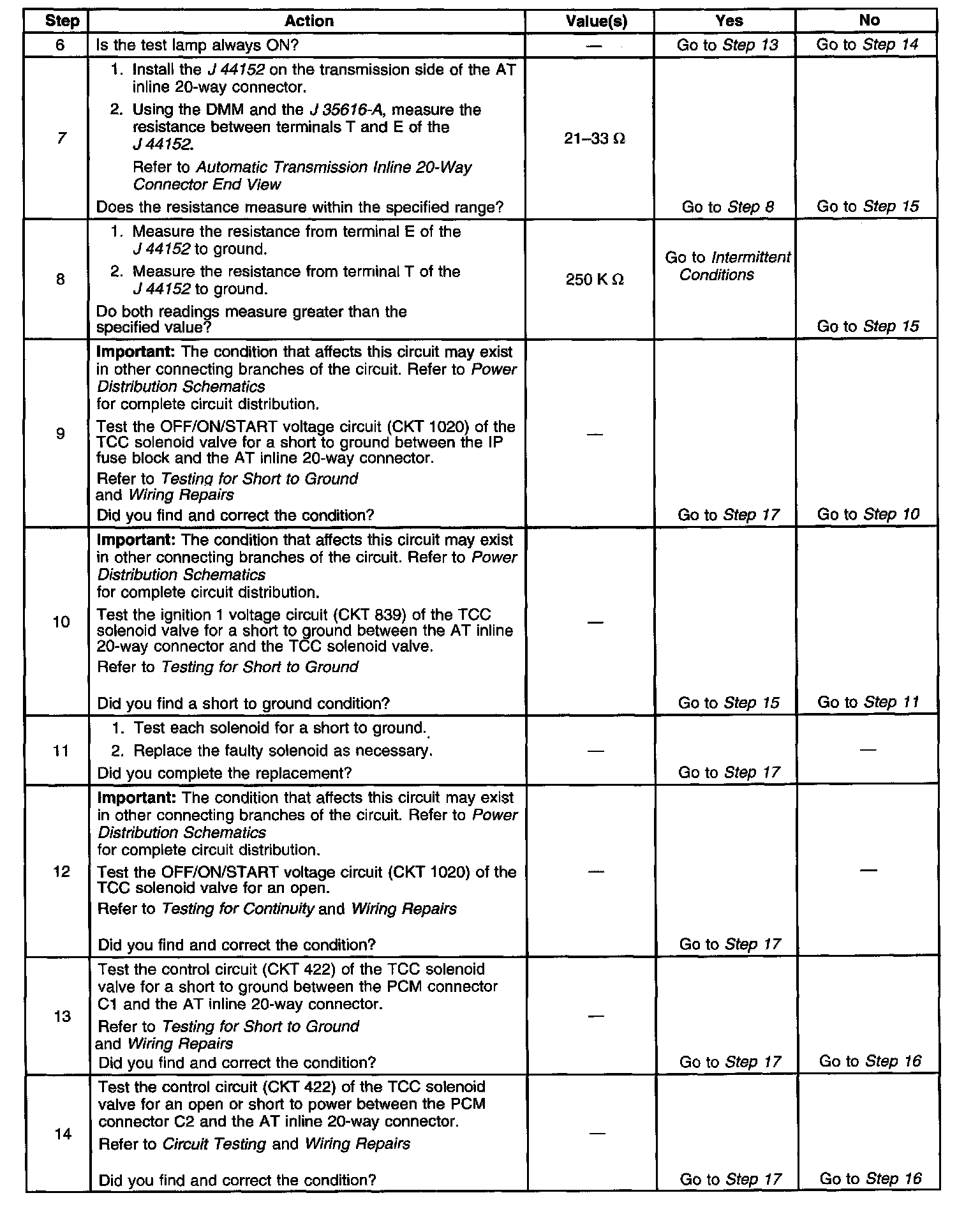 7. This step tests the resistance of the TCC solenoid valve and the automatic transmission (AT) wiring harness assembly.