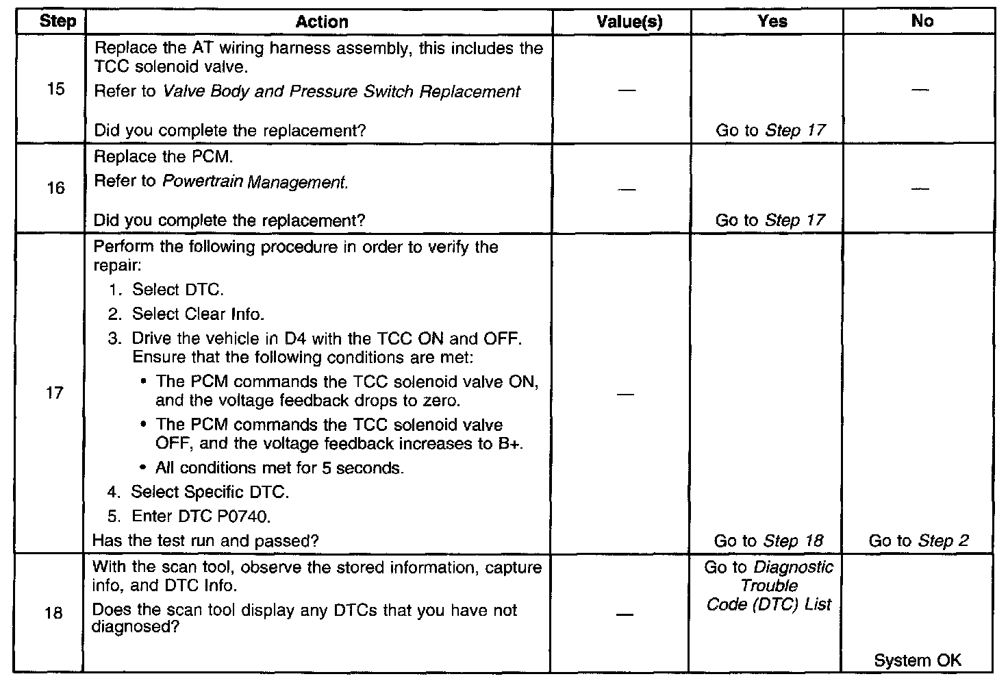 When the PCM detects a continuous open, short to ground or short to power in the TCC solenoid valve circuit, then DTC P0740 sets. DTC P0740 is a type B DTC.