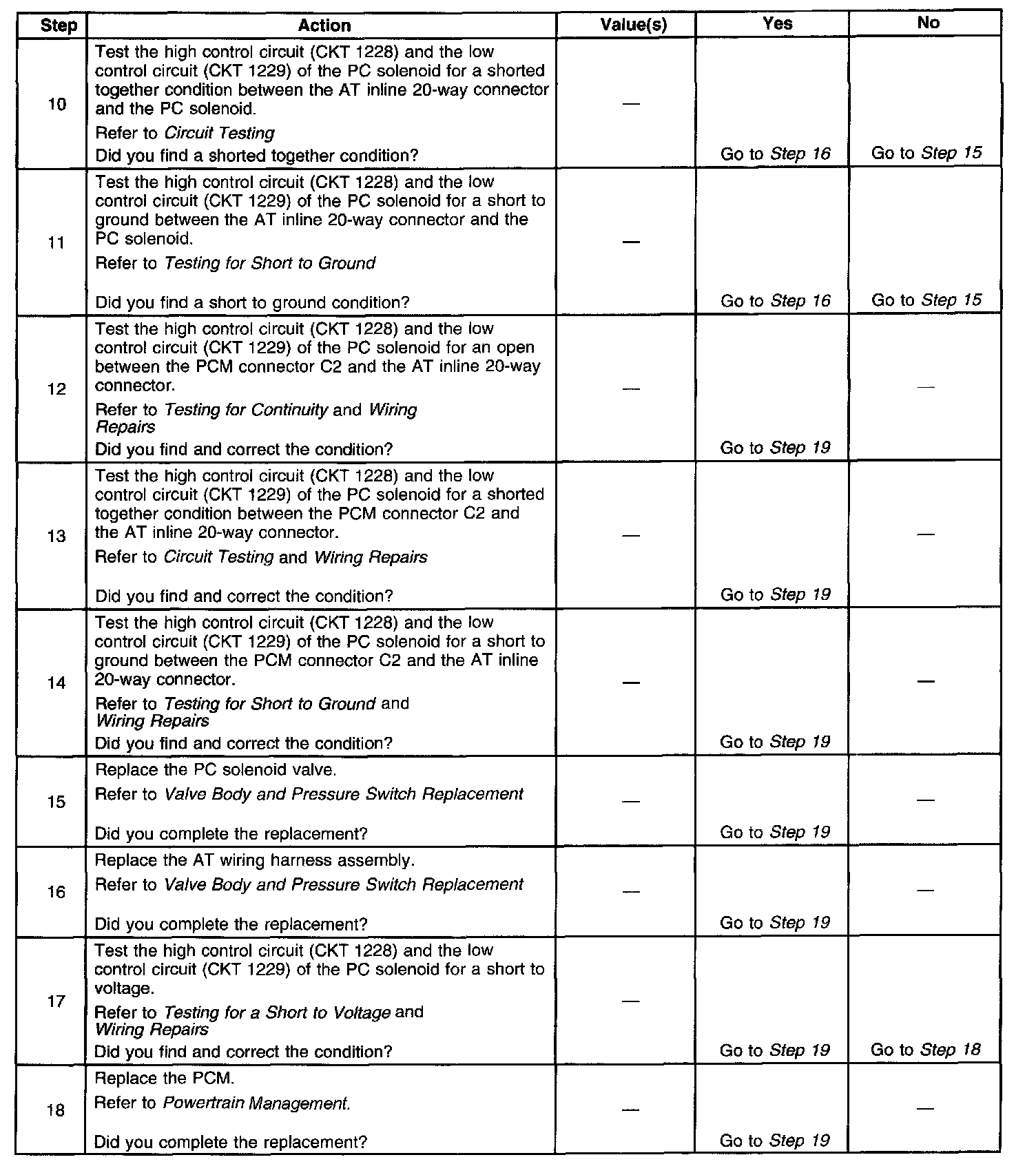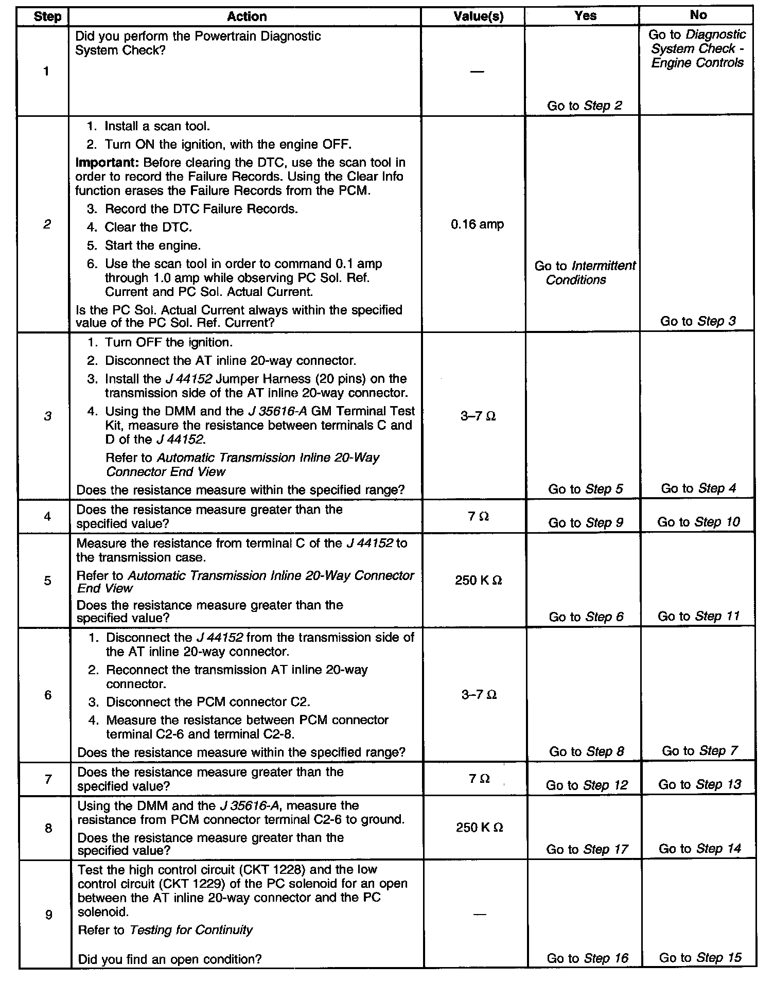 3. This step tests the PC solenoid valve and automatic transmission (AT) wiring harness assembly for incorrect resistance.