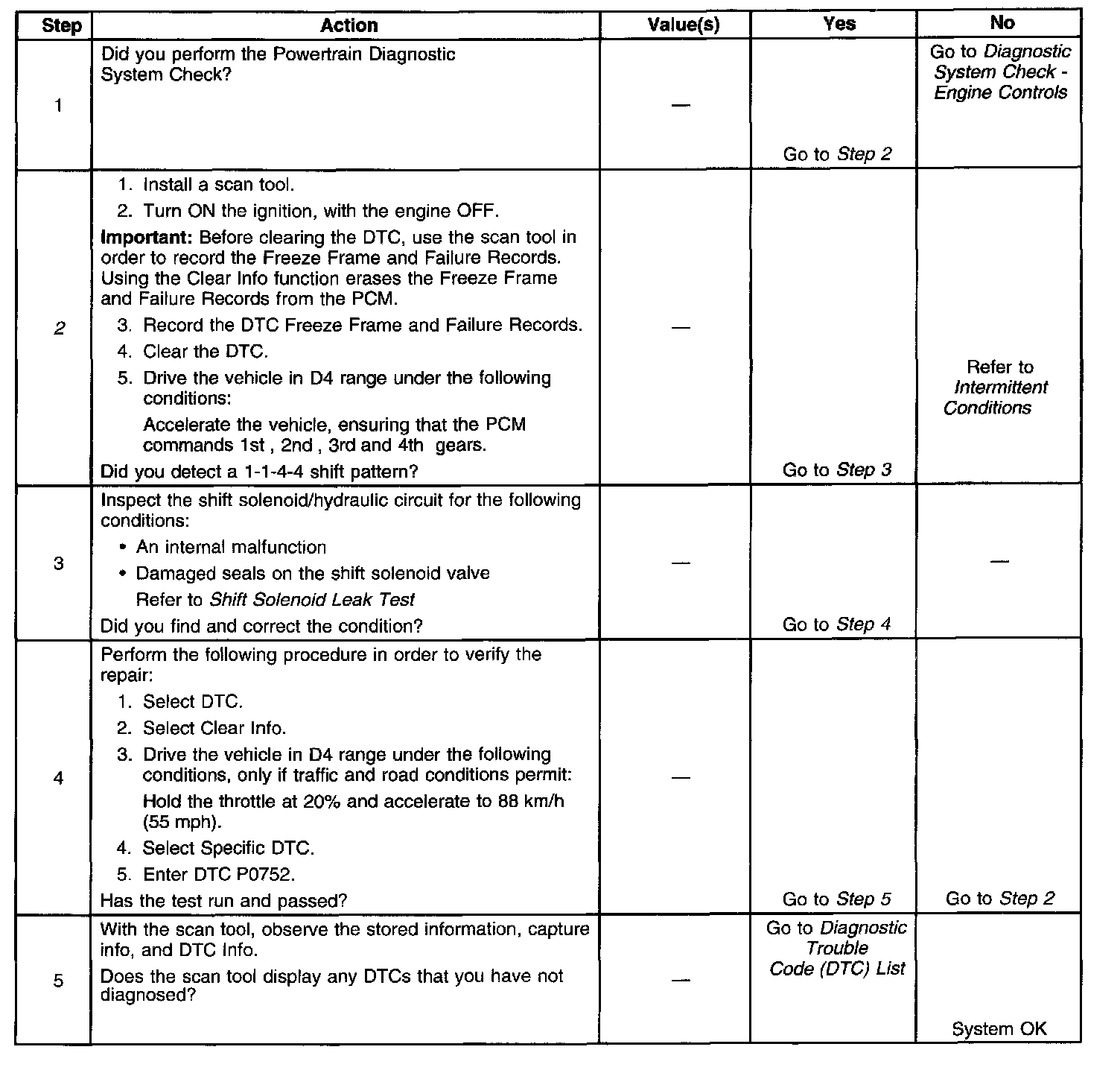 The 1-2 shift solenoid (SS) valve controls the fluid flow acting on the 1-2 and 3-4 shift valves. The 1-2 SS valve is a normally-open exhaust valve that is used with the 2-3 SS valve, in order to allow four different shifting combinations. When the PCM detects a 1-1-4-4 shift pattern, then DTC P0752 sets. DTC P0752is a type B DTC.