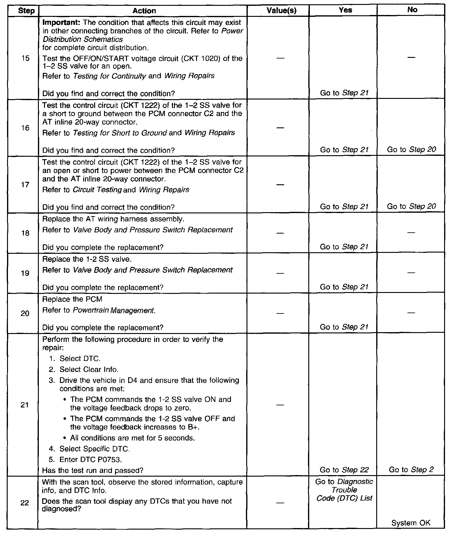The 1-2 shift solenoid (SS) valve controls the fluid flow acting on the 1-2 and 3-4 shift valves. The solenoid is a normally-open exhaust valve. With the 2-3 SS valve, the 1-2 SS valve allows four different shifting combinations. The solenoid attaches to the control valve body within the transmission. The 1-2 SS valve receives ignition voltage through the OFF/ON/START voltage circuit. The powertrain control module (PCM) controls the solenoid by providing the ground path on the 1-2 SS valve control circuit. When the PCM detects a continuous open, short to ground or short to power in the 1-2 SS valve circuit, then DTC P0753 sets. DTC P0753 is a type B DTC.