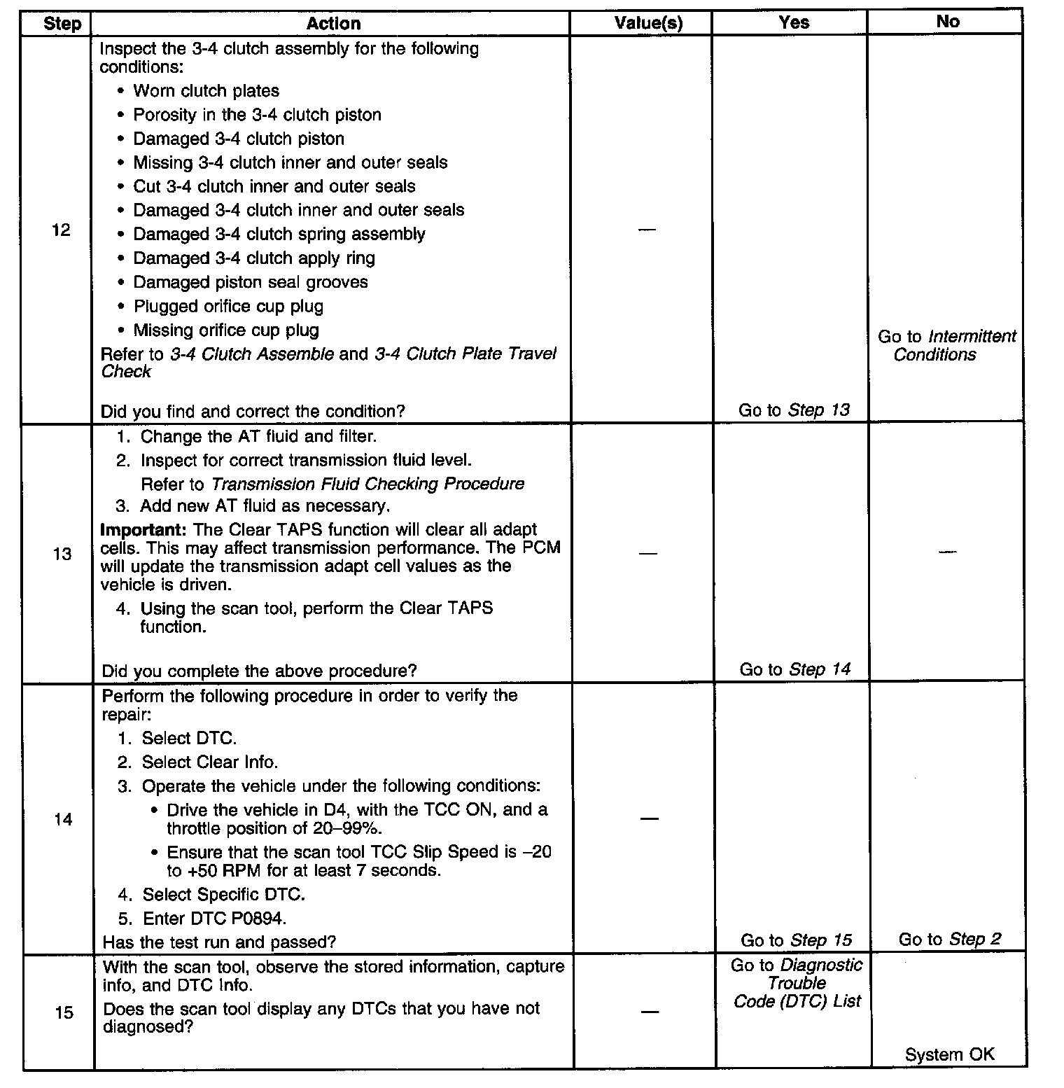 The powertrain control module (PCM) monitors the difference between engine speed and transmission output speed. In D3 drive range with the TCC engaged, the engine speed should closely match the transmission output speed. In D4 drive range, with the TCC engaged, the TCC slip speed should be -20 to+50 RPM. When the PCM detects excessive TCC slip when the TCC should be engaged, then DTC P0894 sets. DTC P0894is a type B DTC.