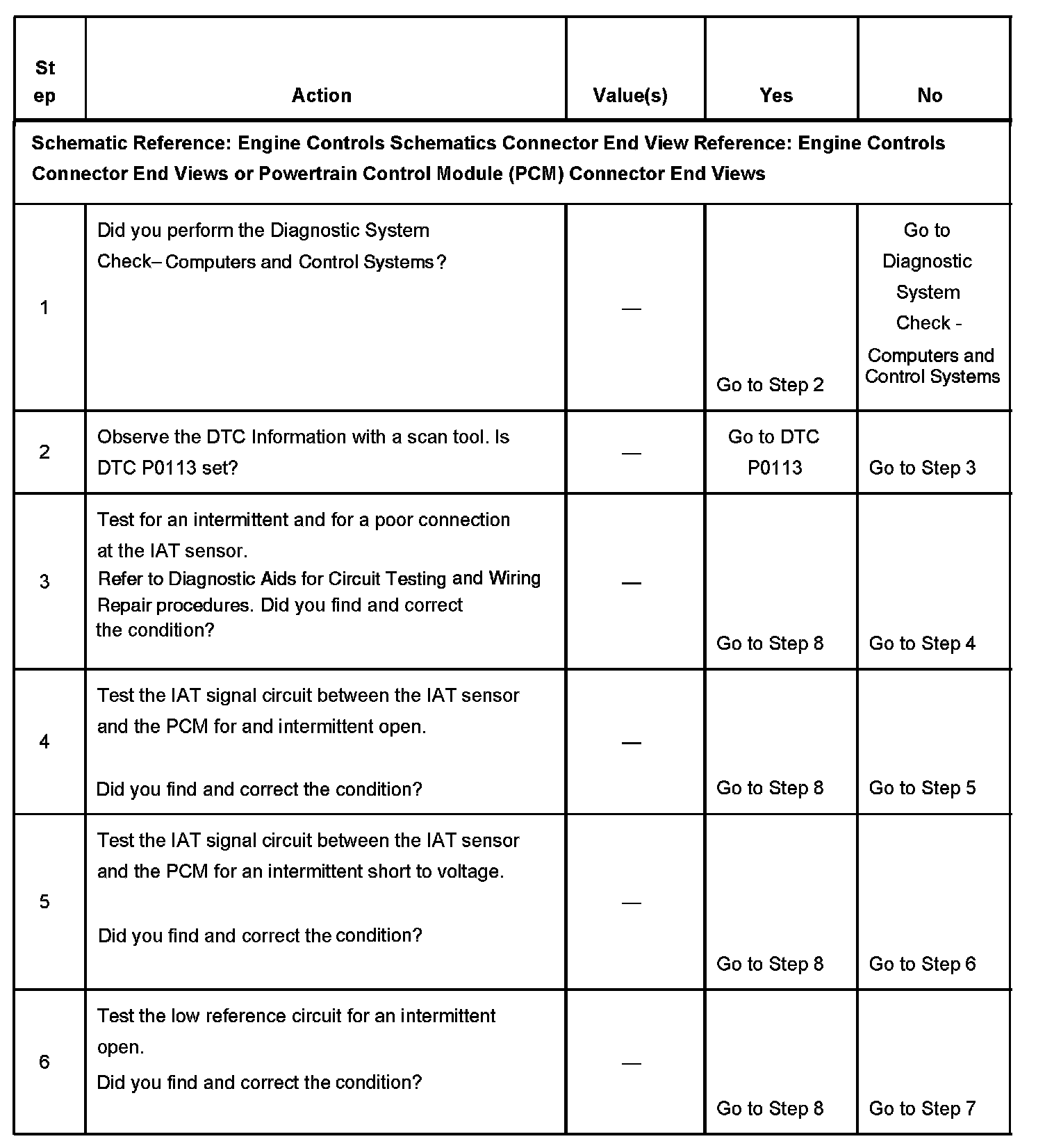 CIRCUIT DESCRIPTIONThe intake air temperature (IAT) sensor is a variable resistor. The IAT sensor has a signal circuit and a low reference circuit. The IAT sensor measures the temperature of the air entering the engine. The powertrain control module (PCM) supplies 5 volts to the IAT signal circuit and a ground for the IAT low reference circuit. When the IAT sensor is cold, the sensor resistance is high. When the air temperature increases, the sensor resistance decreases. With high sensor resistance, the PCM detects a high voltage on the IAT signal circuit. With lower sensor resistance, the PCM detects a lower voltage on the IAT signal circuit. If the PCM detects an intermittent high IAT signal voltage, indicating a low temperature, DTC P1111 sets.