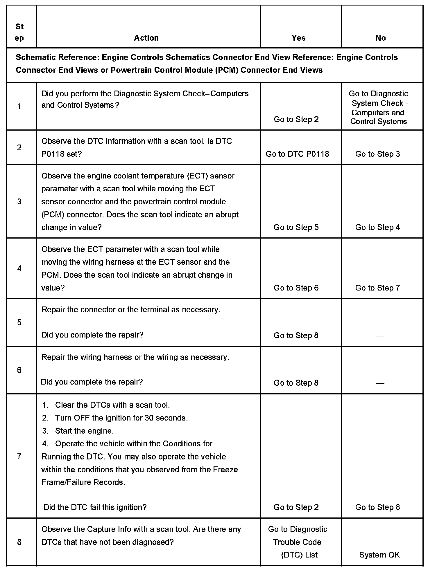 CIRCUIT DESCRIPTIONThe engine coolant temperature (ECT) sensor is a variable resistor, that measures the temperature of the engine coolant. The powertrain control module (PCM) supplies 5 volts to the ECT signal circuit and a ground for the ECT low reference circuit. When the ECT is cold, the sensor resistance is high. When the ECT increases, the sensor resistance lowers. With high sensor resistance, the PCM detects a high voltage on the ECT signal circuit. With lower sensor resistance, the PCM detects a lower voltage on the ECT signal circuit. If the PCM detects an excessively high signal voltage, which is a low temperature indication, DTC P1115 sets.