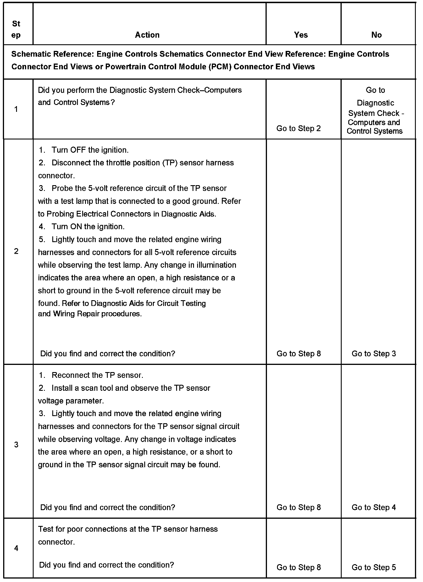 The PCM provides the TP sensor with 5 volts on the 5-volt reference circuit and a ground on the low reference circuit. Rotation of the TP sensor rotor from the closed throttle position to the wide open throttle (WOT) position provides the PCM with a signal voltage from below 1.0 volt to greater than 4.0 volts through the TP sensor signal circuit. If the PCM detects an intermittent excessively low signal voltage, DTC P1122 sets.