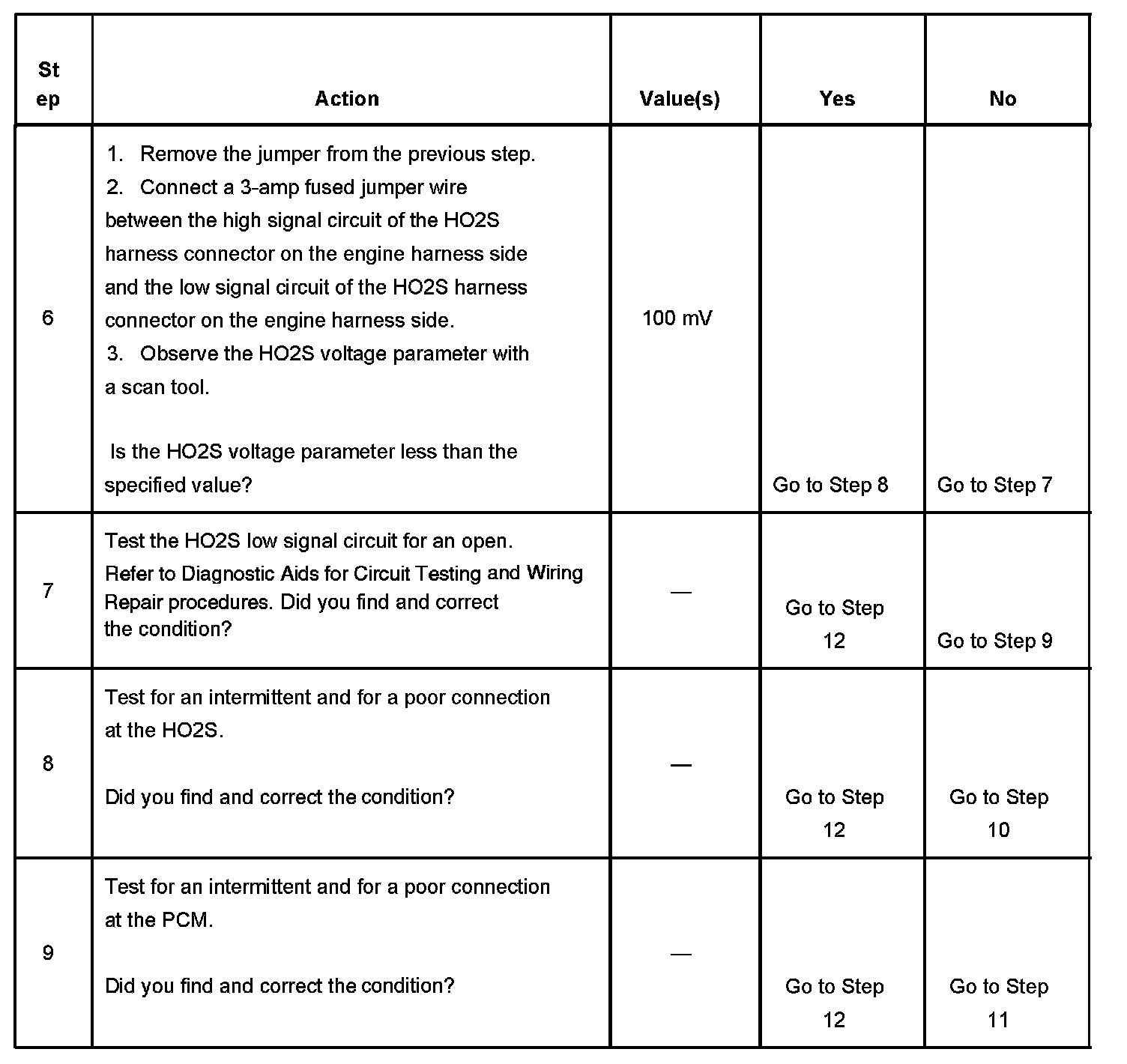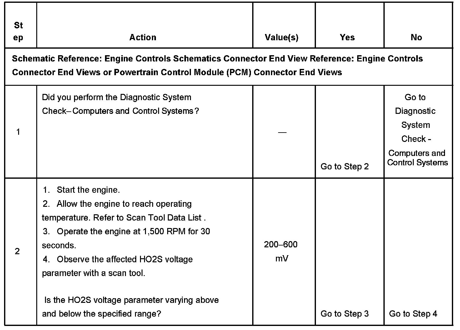 CIRCUIT DESCRIPTIONHeated oxygen sensors (HO2S) are used for fuel control and post catalyst monitoring. Each HO2S compares the oxygen content of the surrounding air with the oxygen content in the exhaust stream. The HO2S must reach operating temperature to provide an accurate voltage signal. Heating elements inside the HO2S minimize the time required for the sensors to reach operating temperature. The powertrain control module (PCM) supplies the HO2S with a reference, or bias, voltage of about 450 mV. When the engine is first started the PCM operates in open loop, ignoring the HO2S voltage signal. Once the HO2S reaches operating temperature and closed loop is achieved, the HO2S generates a voltage within a range of 0-1,000 mV that fluctuates above and below bias voltage. High HO2S voltage indicates a rich exhaust stream; low HO2S voltage indicates a lean exhaust stream. This diagnostic will only run once per ignition cycle. The PCM monitors the number of rich-to-lean and lean-to-rich transitions. A transition is defined as, the HO2S voltage changes from above 600 mV to below 200 mV or from below 200 mV to above 600 mV. If the PCM detects that the number of transitions were less than a specified value, DTCs P1133 or P1153 will set.